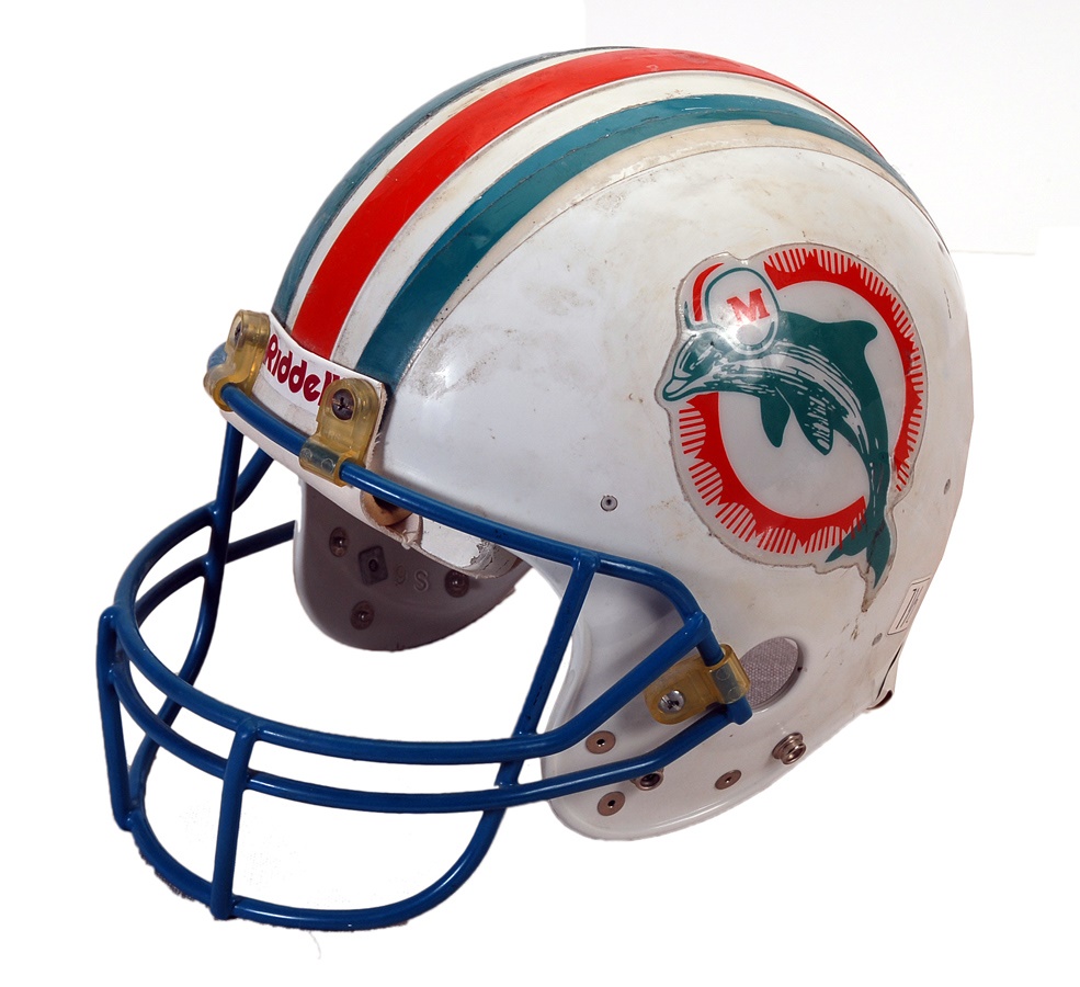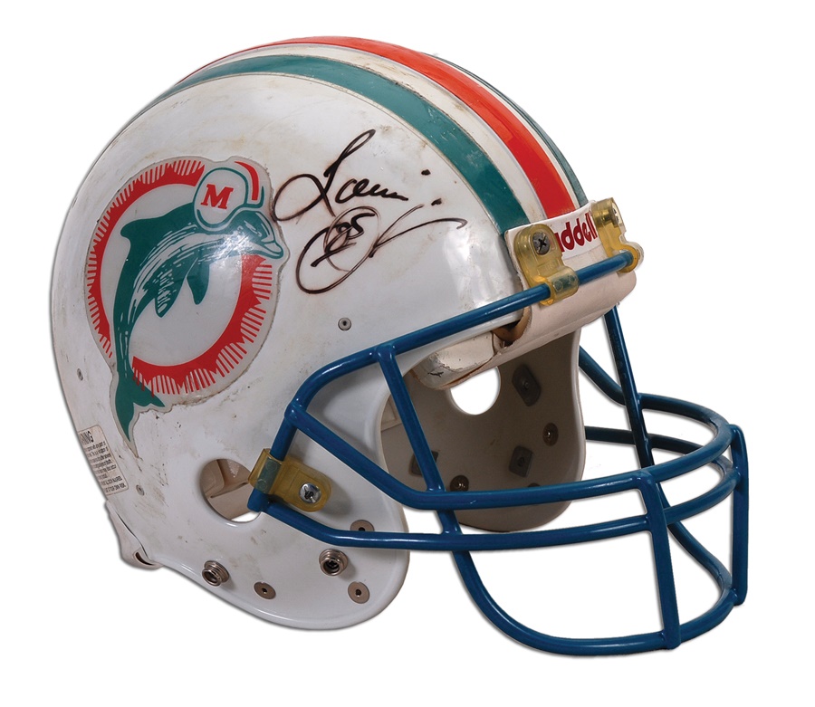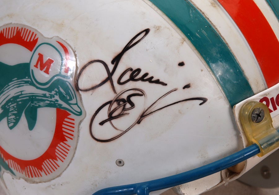 The centerpiece of this lot is a game-worn Miami Dolphins helmet sported by safety Louis Oliver during his seven-year career in Florida. After an All-American career at the University of Florida, Oliver stayed close to home as he was drafted in the first round (25th overall) by Miami in 1989. This size 7 1/2 Riddell helmet shows use and is signed by Oliver on the front in 7.5/10 black Sharpie. Also included is a newspaper article from the November 8, 2011 Sun Sentinel regarding Oliver's induction into the Broward County Sports Hall of Fame.