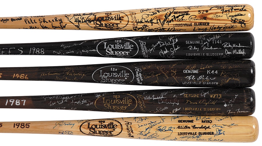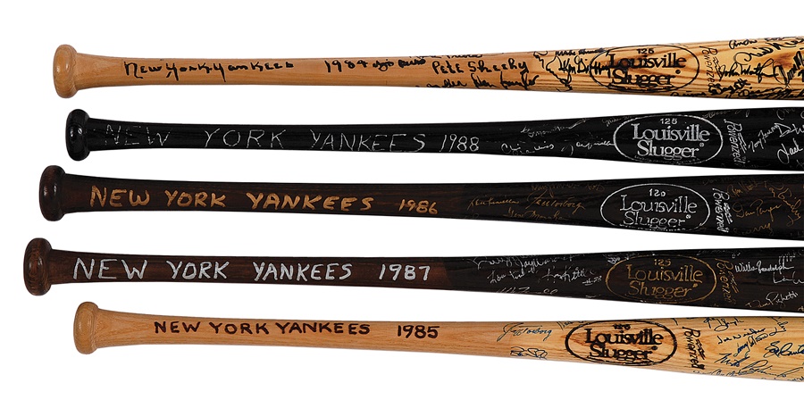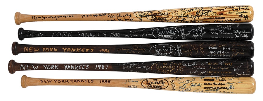 From 1984 to 1988, the New York Yankees averaged 88 wins a year but never made the postseason in those pre-Wild Card days. Still, those were some fine teams that featured some excellent talent, and these five bats from those consecutive seasons are filled with signatures that reflect that. The signatures were obtained in person inside the Yankees clubhouse by a former employee. Greats like Don Mattingly, Billy Martin, Ron Guidry, Willie Randolph, Lou Piniella, Rickey Henderson, Dave Winfield, Dave Righetti, Ken Griffey, Tony Fernandez, Al Leiter and longtime trainer Gene Monahan are all here, as well as many others. The models of the bats are Lou Pineilla (1984), Willie Randolph (1985), Mike Easler (1986), Dave Winfield (1987) and Rickey Henderson (1988). All are professional, game-model bats but do not show any use. Overall, the bats are Louisville Sluggers, feature at least 40 signatures each and grade NRMT.
