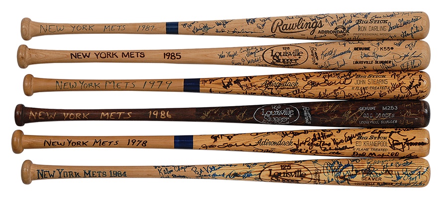 Mets fans and collectors will cherish this assemblage of signed bats, each a professional game-model with 40+ signatures. Included in the lot is a dark-toned Doc Gooden Louisville Slugger model from the heralded 1986 team that won a club-record 108 games before capturing the World Series. There are team personnel and even broadcasters such as Tim McCarver included. There are also bats from 1987 (Rawlings Ron Darling), 1985 (Louisville Slugger), 1984 (Louisvillle Slugger Tom Seaver), 1978 (Adirondack Ed Kranepool) and 1979 (Adirondack John Stearns). All signatures were obtained in person inside the Mets clubhouse. The 1986 bat is the only one that shows any use. The greats and fan favorites are here including the recently deceased Gary Carter, George Foster, Joe Torre, Rusty Staub, Jerry Koosman, Keith Hernandez, Darryl Strawberry, Dwight Gooden, Jesse Orosco, Lenny Dykstra, Lee Mazzilli, Bobby Valentine, Mookie Wilson, Larry Bowa, David Cone, Gregg Jefferies, and countless others. Signatures average 8/10.