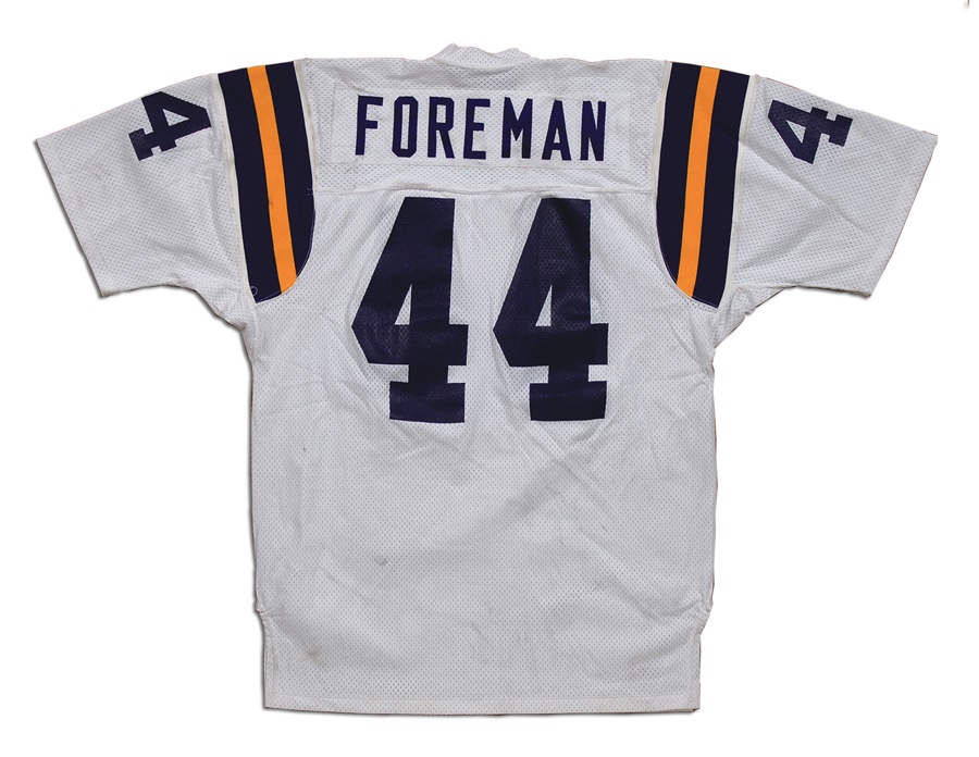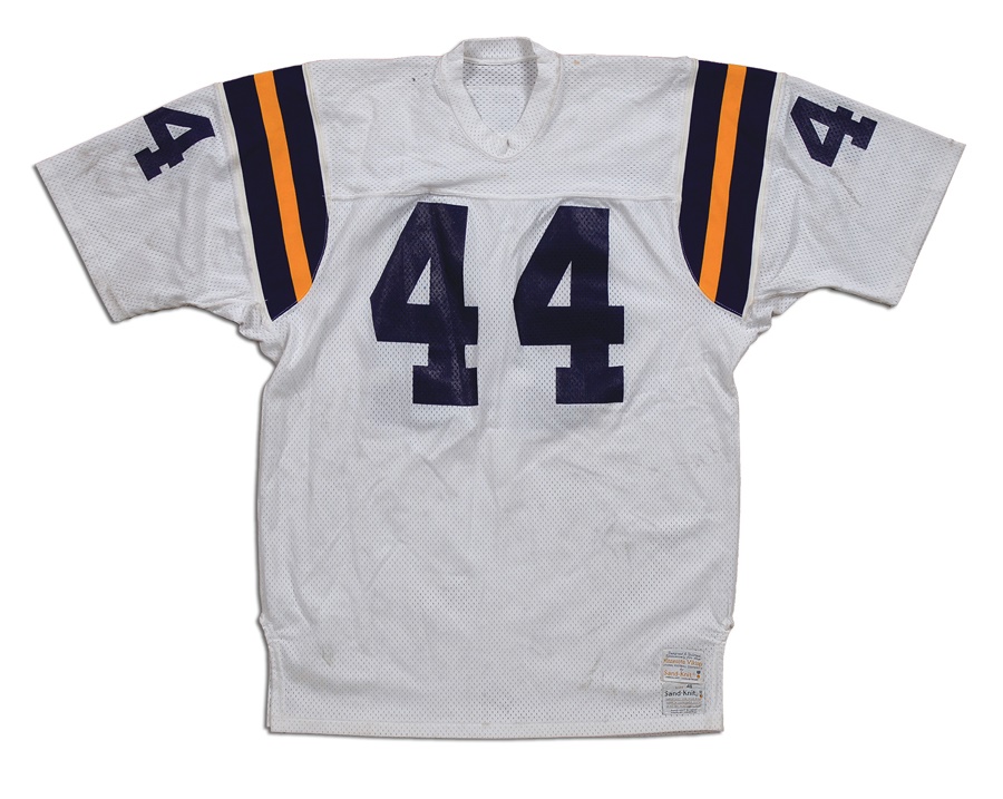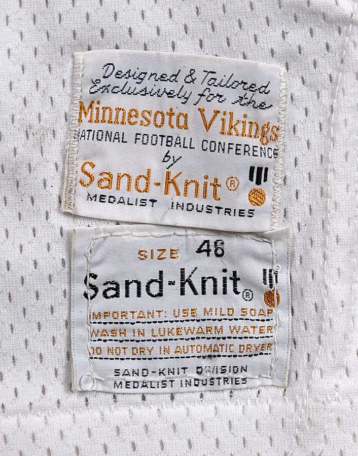 The Minnesota Vikings' first-round draft choice in 1973, Chuck Foreman was a versatile running back who often caught passes in the backfield. This white road jersey bearing his purple number "44" had all numerals on the front, back and shoulders heat-pressed on while the letters on the name plate are sewn on. Tagging on the tail reveals the uniform was "designed and tailored exclusively for the Minnesota Vikings National Football Conference by Sand-Knit Medalist Industries." A second Sand-Knit tag below the first one shows size 48. Shows light but definite use. Foreman played eight seasons in the NFL - the first seven with the Vikings - and was a five-time Pro Bowl selection.