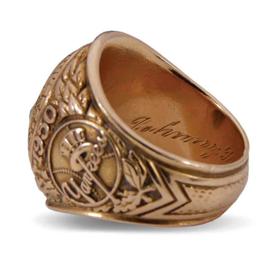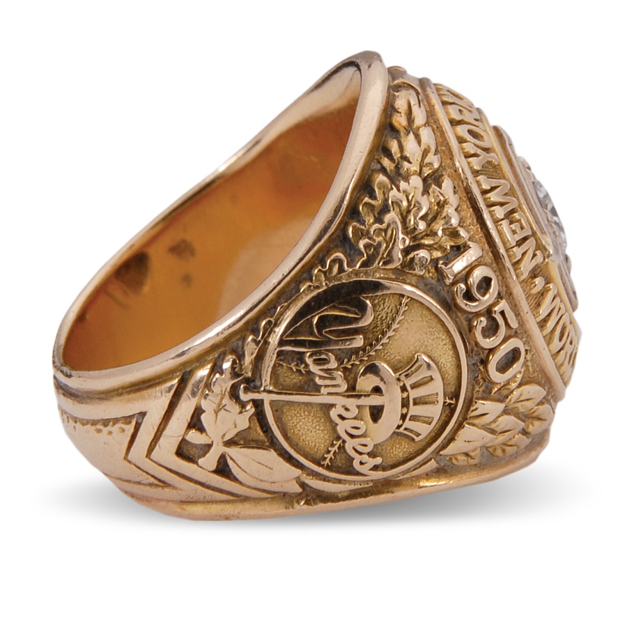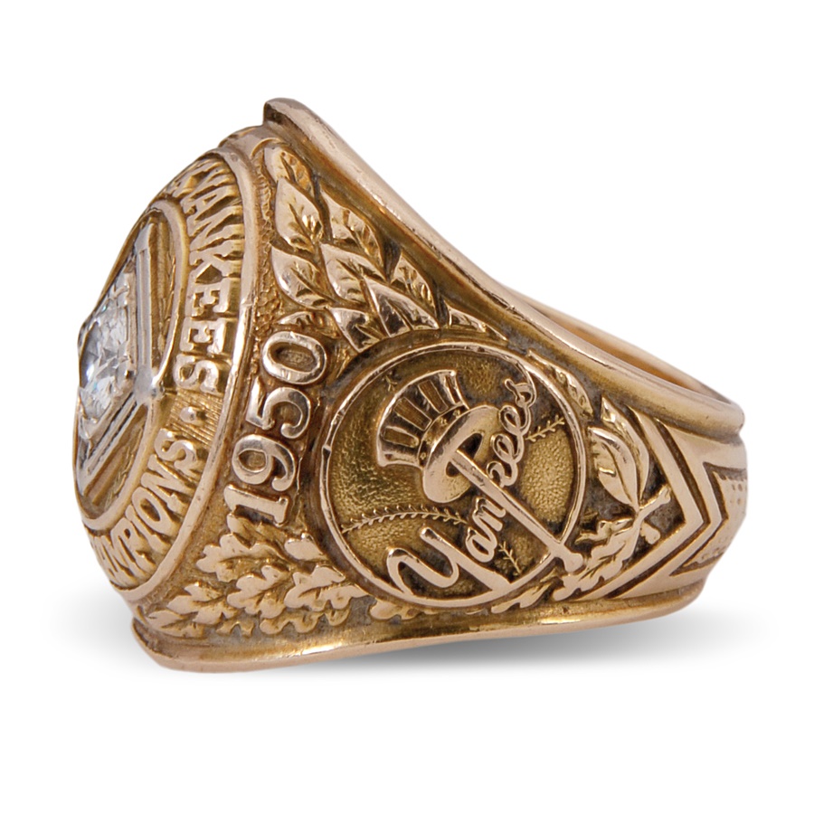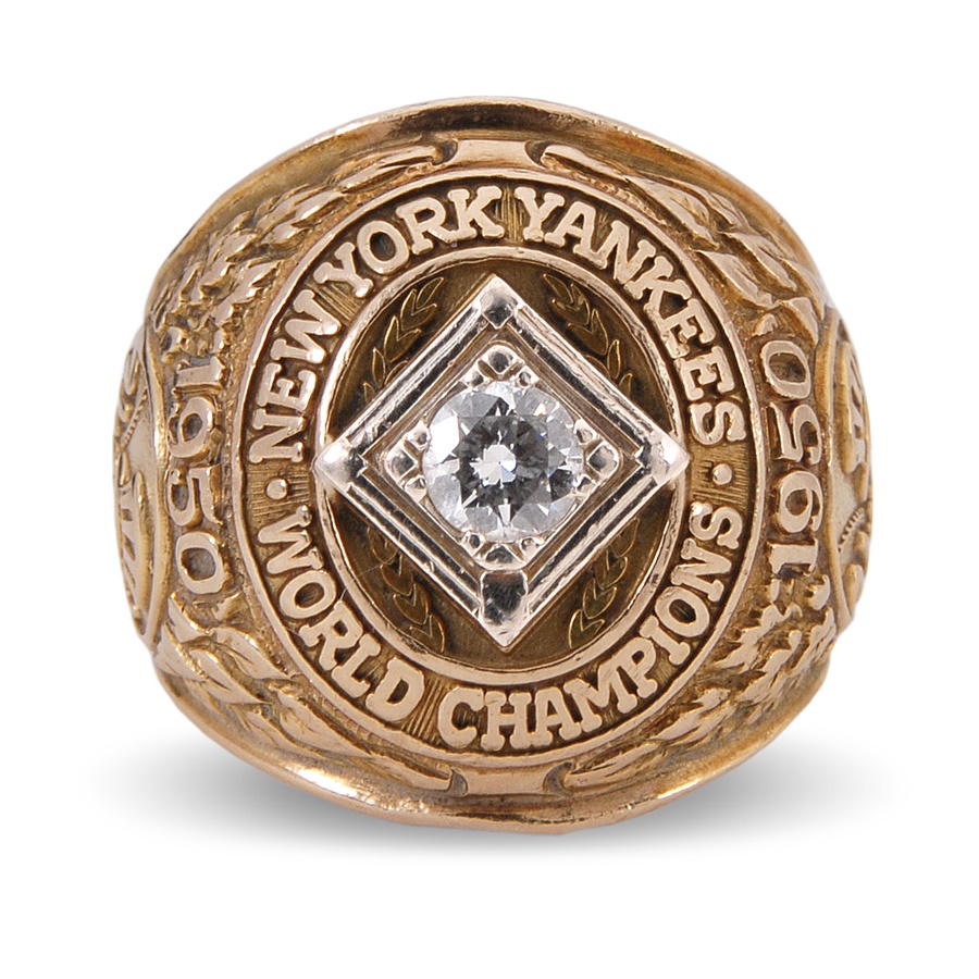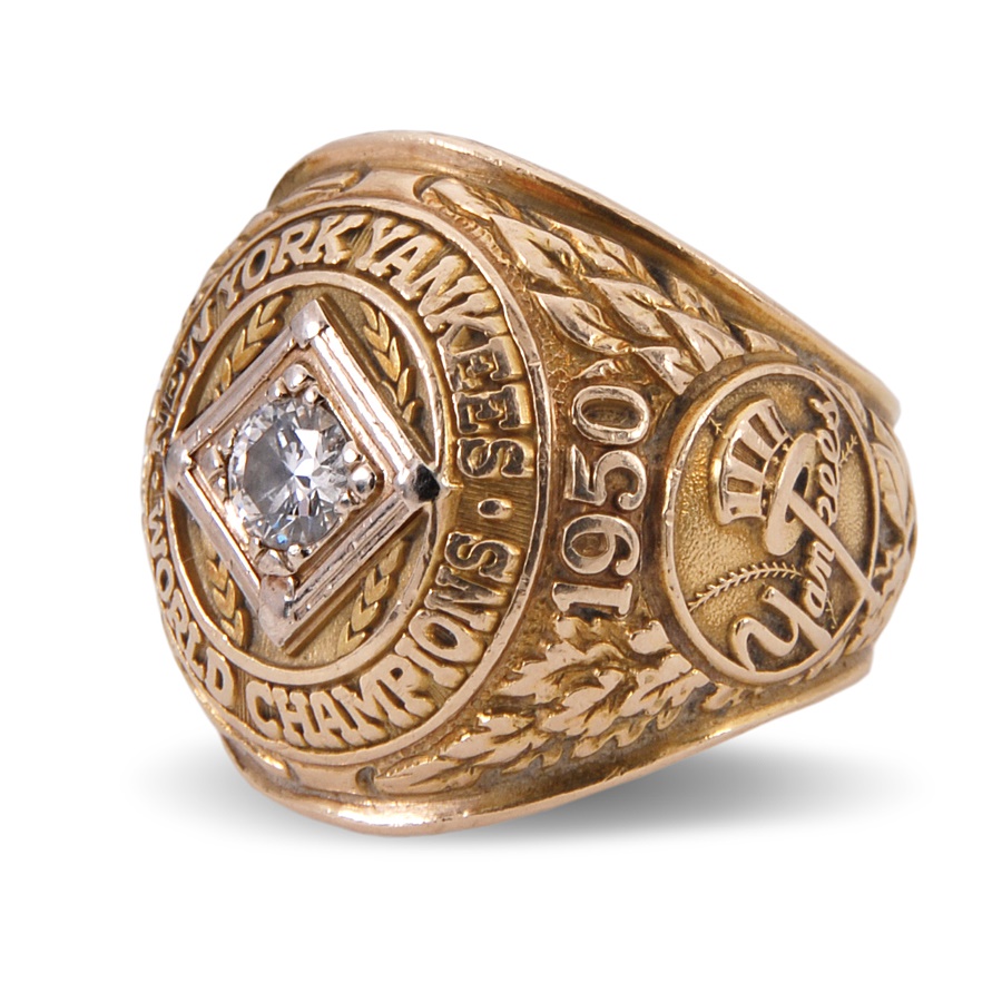 The 1950 Yankees swept the Whiz Kids Phillies in the World Series, and this handsome ring comes from the fingers of utility infielder-outfielder Johnny Hopp, who played just 19 games for the champs that season but batted a robust .333. The ring features a real diamond on the top, plus Dieges and Clust and 14 Karat stampings on the inside. "Johnny Hopp" is also engraved inside. The Yankees logo and 1950 are on both sides, and the wording: NEW YORK YANKEES WORLD CHAMPIONS on the face. Overall very nice and in EX-MT condition, it comes from the Barry Halper collection with a letter from Johnny Hopp, who stayed in the Bronx two more seasons as a utility player.