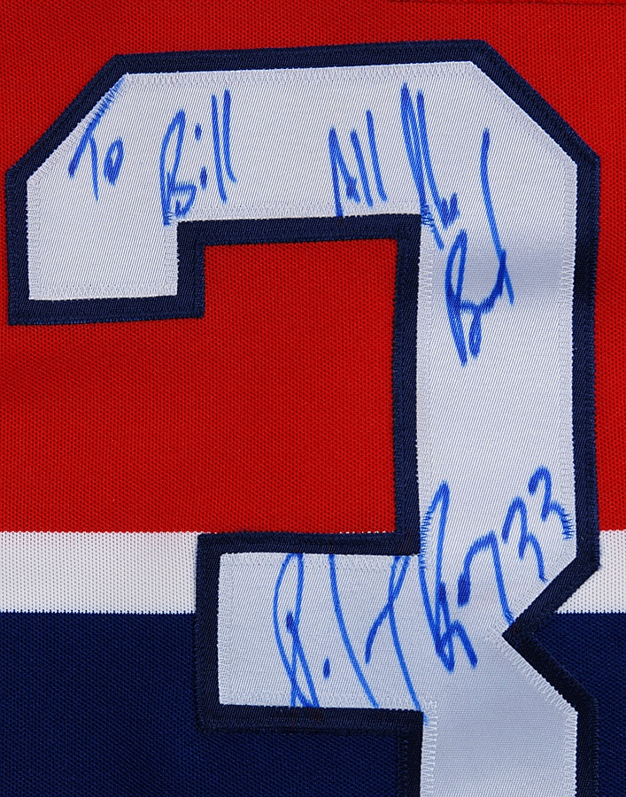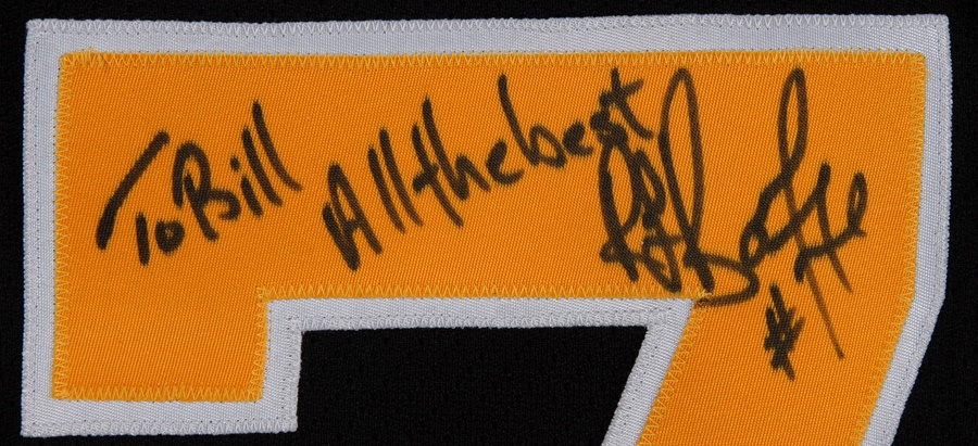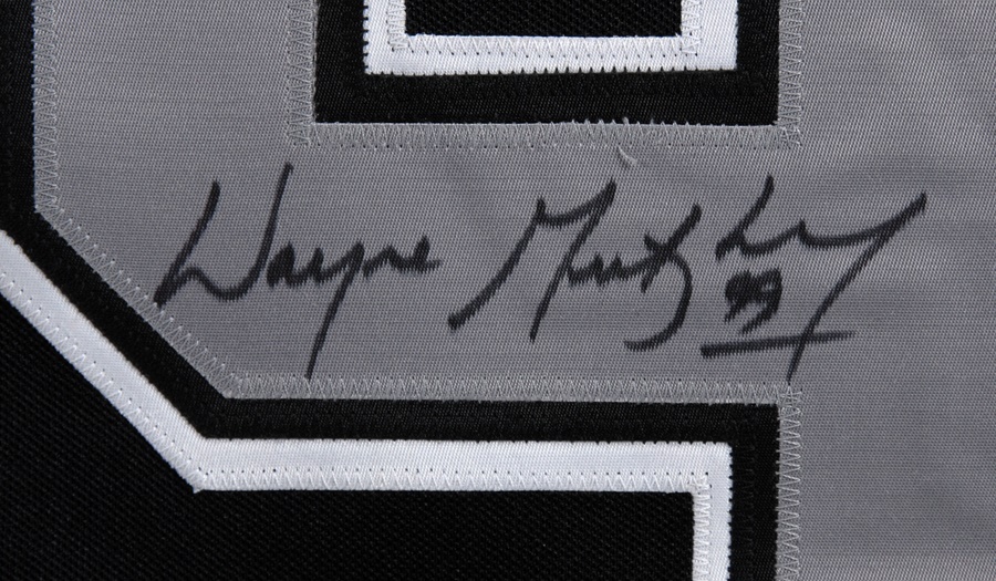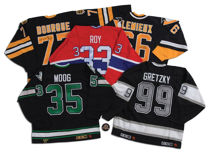 A great selection of high-quality NHL jerseys is available in this lot. All are replica authentic jerseys and autographs include: Wayne Gretzky (black Los Angeles Kings, personalized), Andy Moog (black Dallas Stars, personalized), Mario Lemieux (black Pittsburgh Penguins), Patrick Roy (red Montreal Canadiens, personalized) and Ray Bourque (black Boston Bruins, personalized). The signatures average 8 out of 10 and the jerseys are all unworn, NRMT condition. Included as an added bonus is a “Thanks for the memories” puck commemorating the final year of the old Boston Garden in 1995, marked as “The Last Hurrah” and dated from a game against the Montreal Canadiens on September 26, 1995