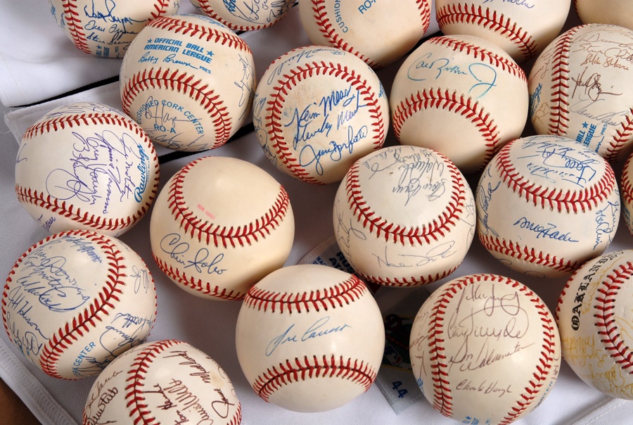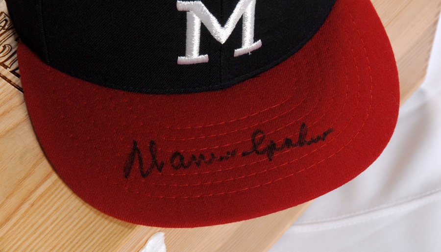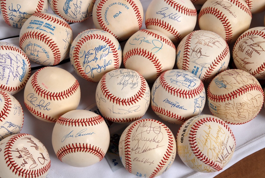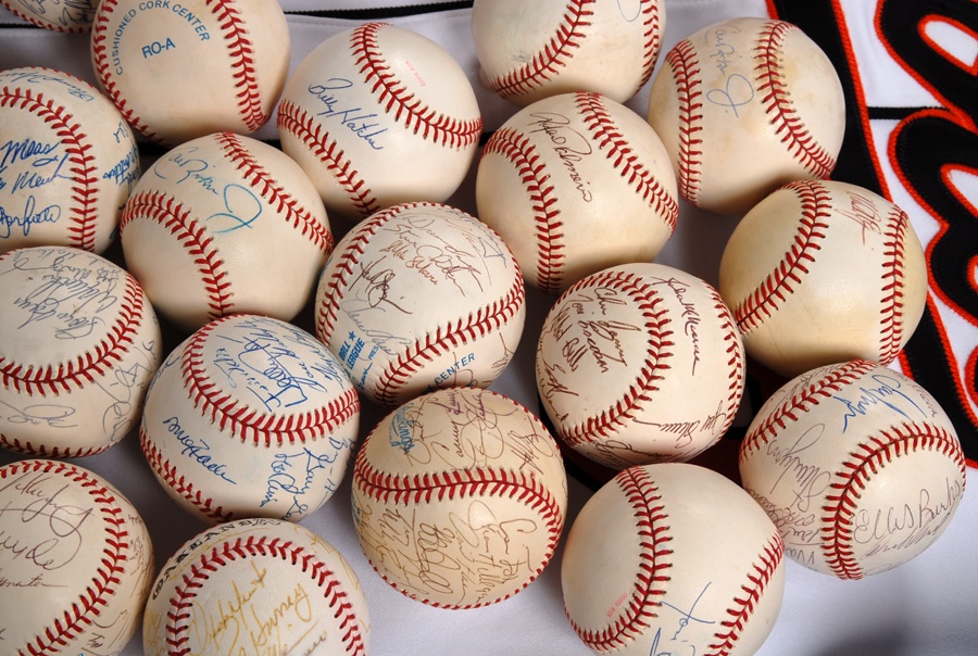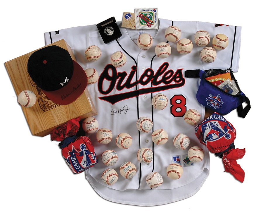 Baseball fans of all ages will love this magic box of assorted coIlectibles. Included in this lot is Warren Spahn Limited Edition Signed Milwaukee Braves Hat (in wooden collector's box), Cal Ripkin Signed Replica Jersey, Larry Doby medallion, and various odds and ends. Also included is an assortment of over 25 of baseballs, some commemorative and many signed. Single-signed items include the likes of Billy Hatcher, Rafael Palmiero, and Mike Mussina, as well as several team-signed balls. Most are in Very Good to Excellent condition and the signatures are also in generally excellent condition.