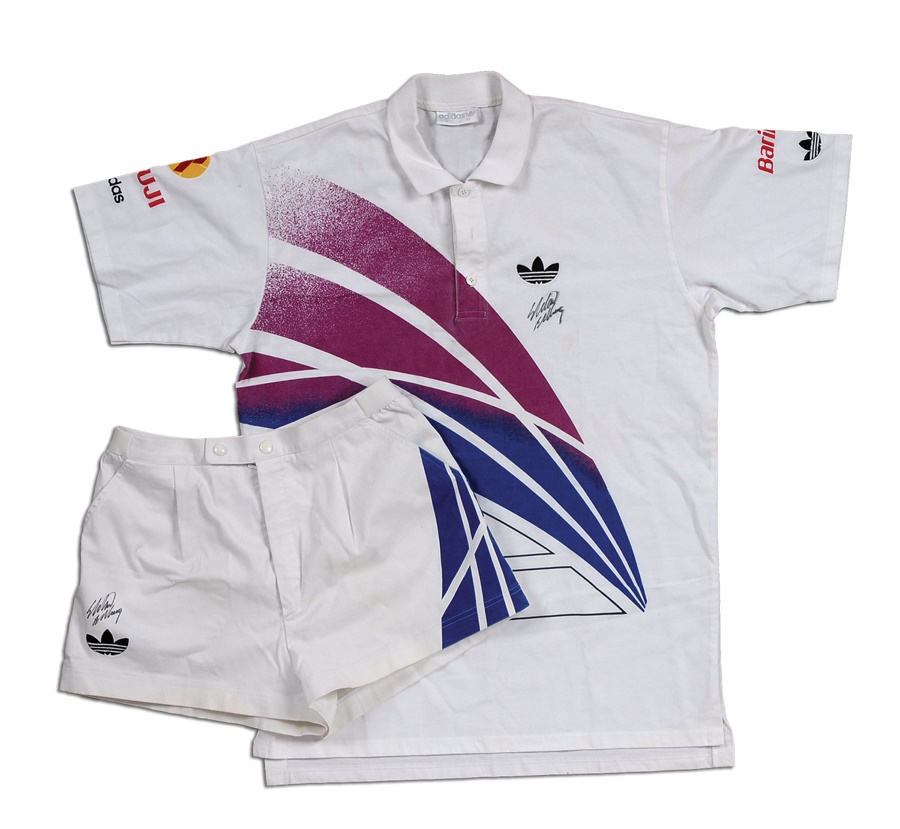 This is a great item for the true tennis aficionado. This shirt and shorts were worn in match play by six-time Grand Slam winner Stefan Edberg, who also signed both pieces. The top is an Adidas size D 52, white with blue and purple design and sponsor logos for Fuji Film and Barilla stitched into the shoulders. The shorts are also made by Adidas, white with blue stripe, elastic waistband and no tags visible. Both signatures are in black Sharpie and rate approximately 7.5/10. These show some nice use and are in Excellent condition.