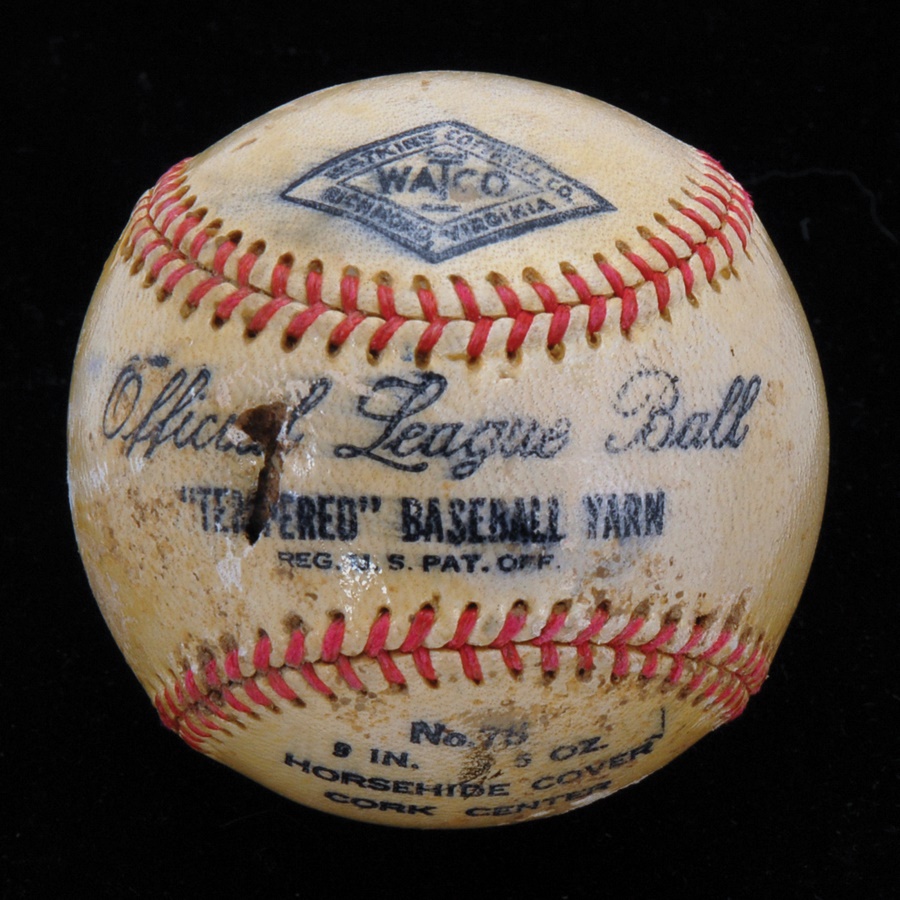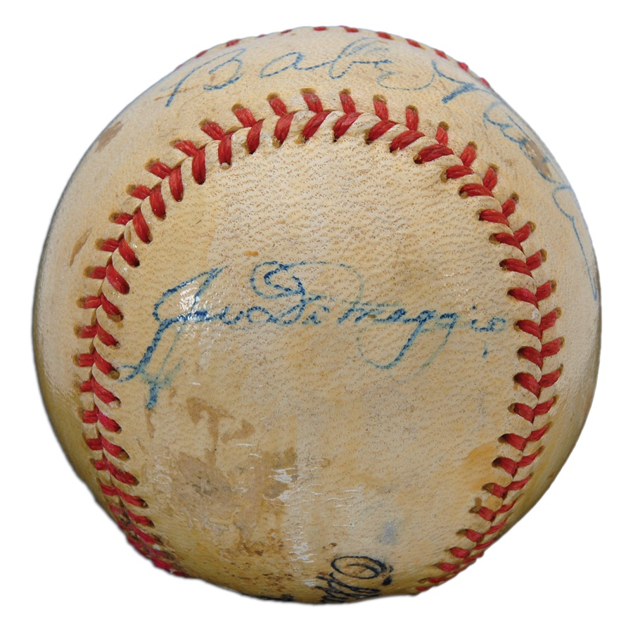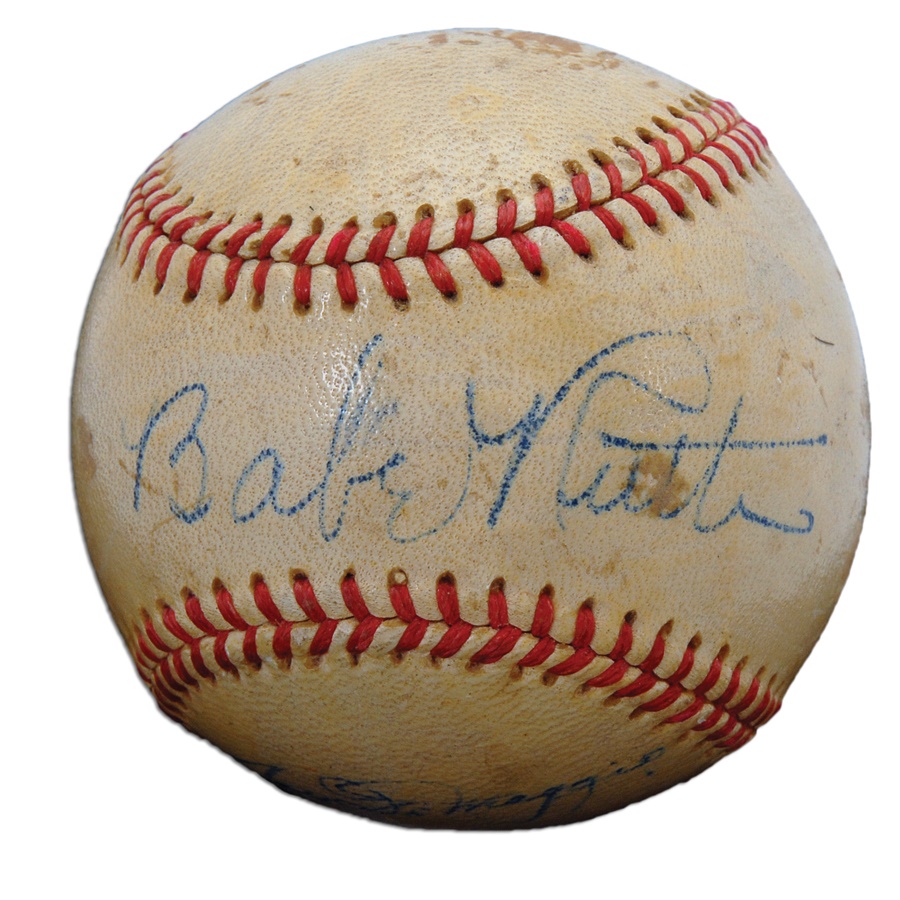 Here's a highly intriguing combo baseball that showcases Babe Ruth's signature on the sweet spot in blue fountain ink and rating 6.5/10, as well as the autograph of fellow icon Joe DiMaggio on a side panel in blue fountain ink rating 7/10. It's an Official League Ball by the Watco Company and features a light protective coating. There's also a gash on the labeling. Judging by the DiMaggio signature, this was signed circa 1940. Though Ruth and DiMaggio never played together, they remain Yankees royalty, as well as first-ballot Hall of Famers. The larger-than-life Ruth held the home run title for roughly half a century and is still considered by many as the greatest player to ever set foot on the diamond, establishing similar career records for RBI and slugging percentage. DiMaggio's personality was diametrically opposed to that of Ruth's as "Joltin' Joe's" success almost seemed to interfere with his personal life. Still, he compiled a .325 lifetime batting average and authored the world-famous 56-game hitting streak that has remained the gold standard. This is a ball touched by greatness in every sense of the word!