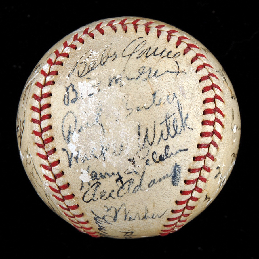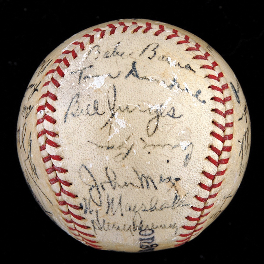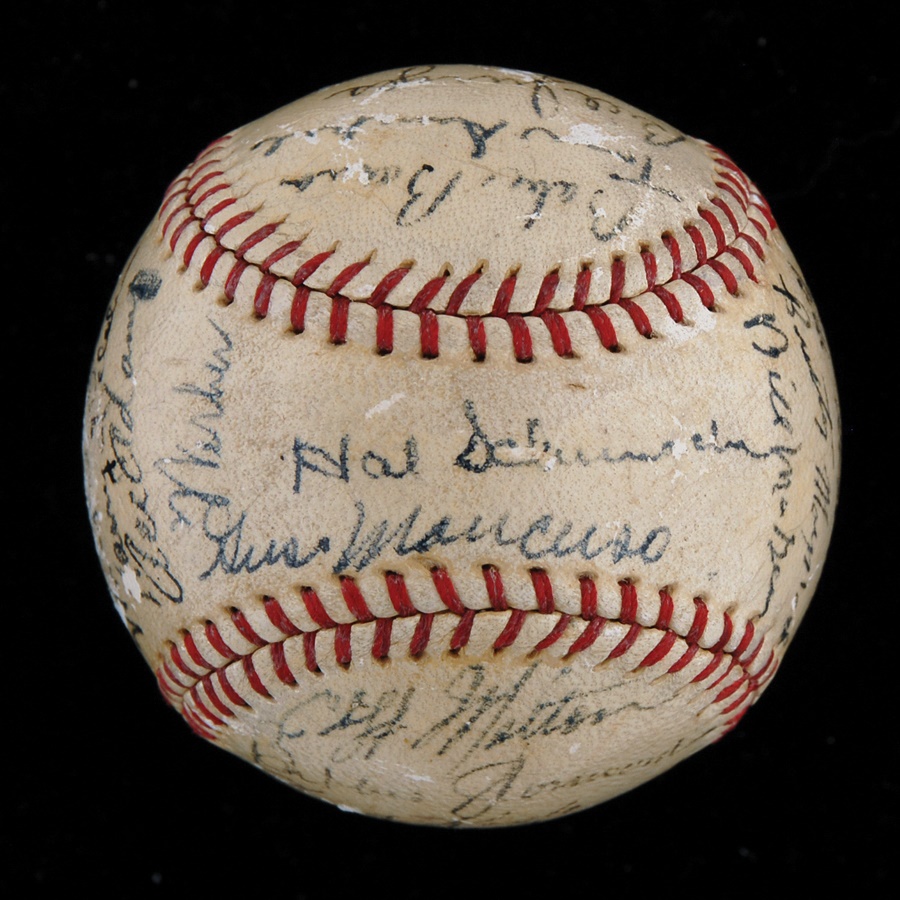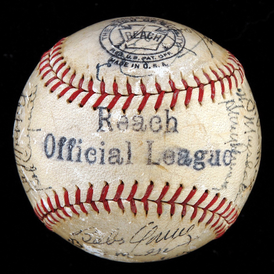Mel Ott's breathtaking side-panel signature highlights this magnificent ball that boasts 27 New York Giants autographs in all. Other notable names on the official Reach National League (Frick) baseball are Carl Hubbell, Johnny Mize, Gus Mancuso and Ace Adams. Most of the signatures are strong and average EX/.NRMT quality. JSA LOA included.