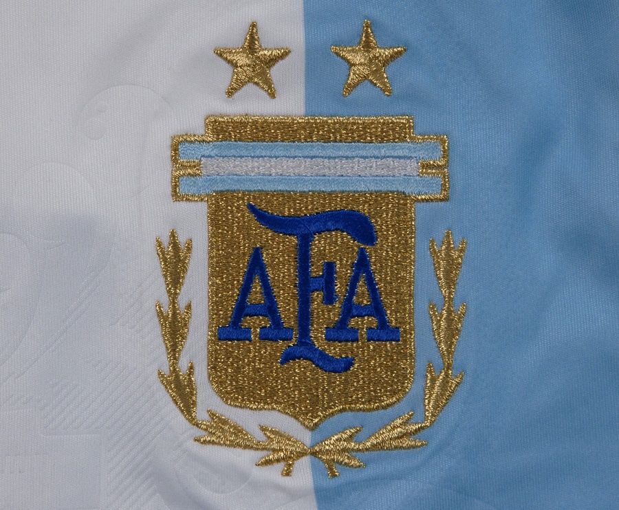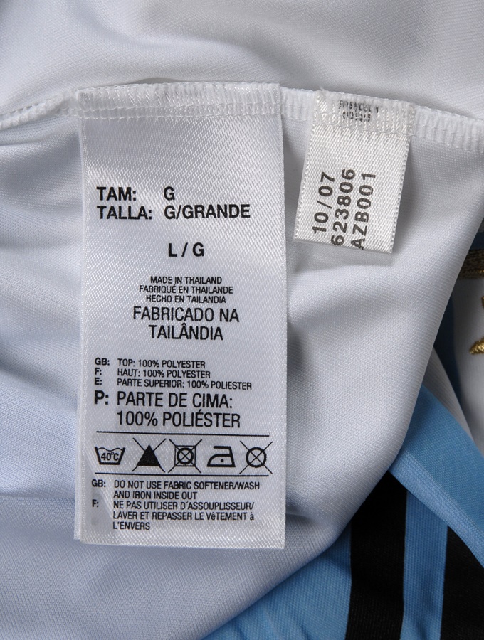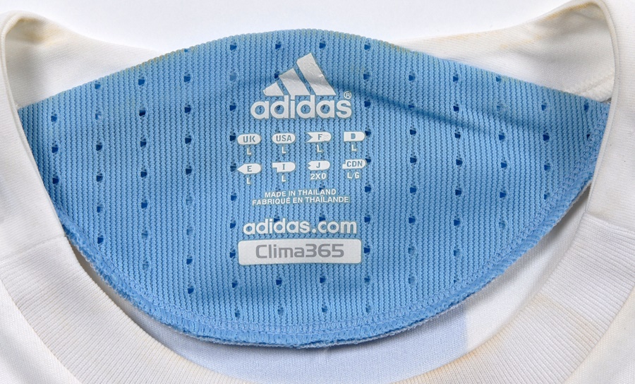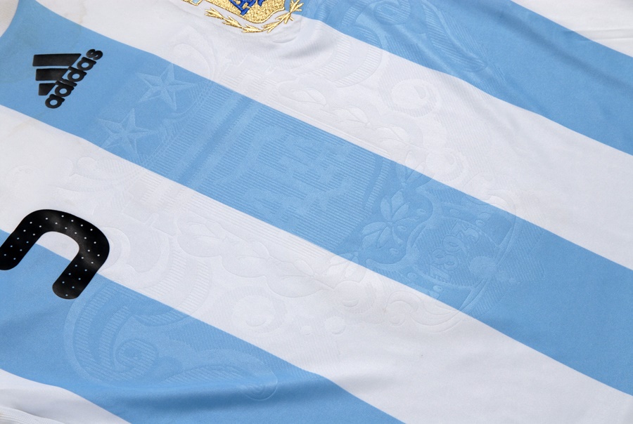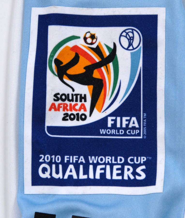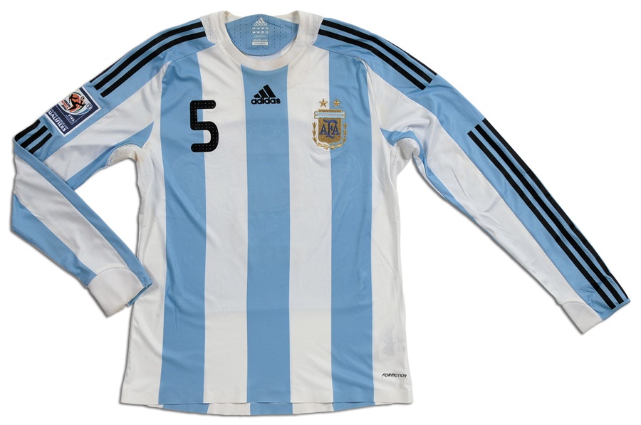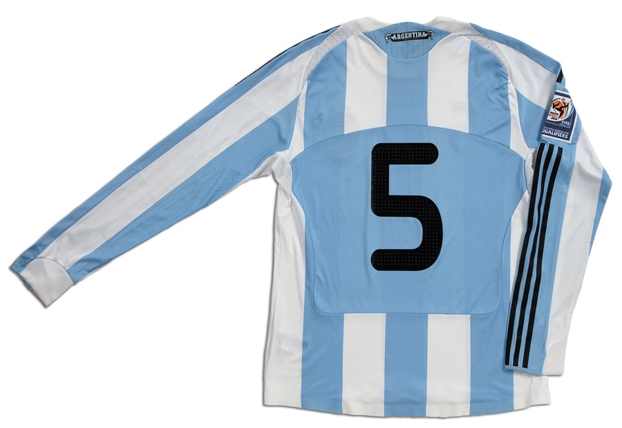 This jersey was used by Argentine Fernando Gaga in the contest between his national team and Colombia, in a qualifying match for the 2010 World Cup. The qualifier was played at River Plate Stadium in Buenos Aires on June 6, 2009, in a game won by the hosts by a 1-0 score. This long-sleeved Adidas shirt features the trademark broad-striped powder blue and white design, and the number "5" ironed on the right breast with an AFA crest patch ironed on the left. The right side has an Official 2010 FIFA World Cup Qualifiers rubber iron-on, and the back has Gago's number "5" (no name) and an "Argentina" rubberized iron-on at the collar. Shows what appear to be sweat stains around the collar, otherwise in NRMT condition.