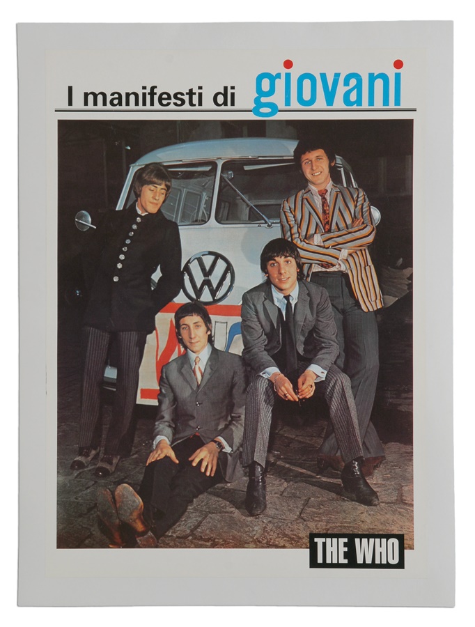 Who are they - who are YOU? This poster depicts the legendary rock band, The Who, in their early stages in the 1960s, judging by the short, straight coif of lead singer Roger Daltrey. Fellow band members Pete Townshend, Keith Moon and John Entwistle are also in this full-color poster, which measures 16.5x23", slightly larger on its linen backing. The Brit rockers are shown sitting around the front of a Volkswagen Van, and the lettering above the image reads "I manifesti di giovani," (or "posters of the young," loosely translated from Italian). This poster is in NRMT condition and presents a great look back at the rock idols, from back in "My Generation."