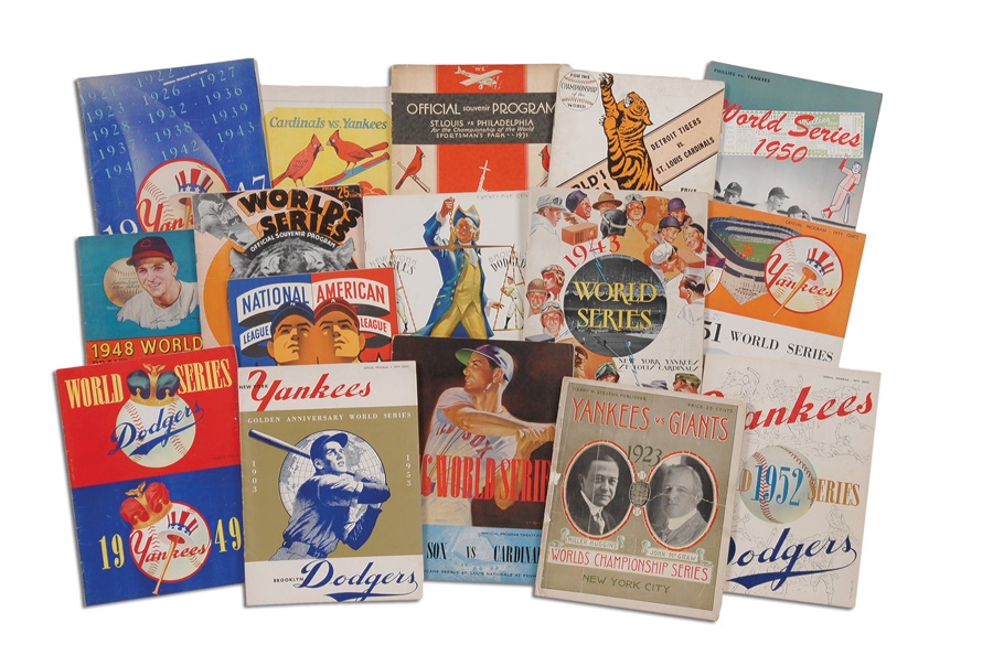 A great selection of programs spanning three decades of the Fall Classic are contained herein. Programs include: 1923 (Yankees-Giants, FR); '28 (Cardinals-Yankees, FR-GD); '31 (St. Louis-Philadelphia, GD); '34 (Detroit-St. Louis, GD); '35 (Detroit-Cubs, GD-VG); '41, (Yankees-Brooklyn, EX-MT); '43 (Yankees-St. Louis, VG+); 1945 (Detroit-Cubs, EX); '46 (Boston-St. Louis, VG-EX); '47 (Yankees-Brooklyn, VG+); '48 (Boston Braves-Cleveland, EX); '49 (Brooklyn-Yankees, VG-EX); '50 (Yankees-Philadelphia, EX+); '51 (Yankees-Giants, writing on cover, otherwise EX-MT); '52 (Yankees-Brooklyn, EX); and '53 (Yankees-Dodgers, EX). An outstanding look at World Series' past.