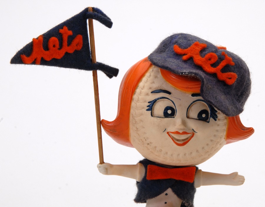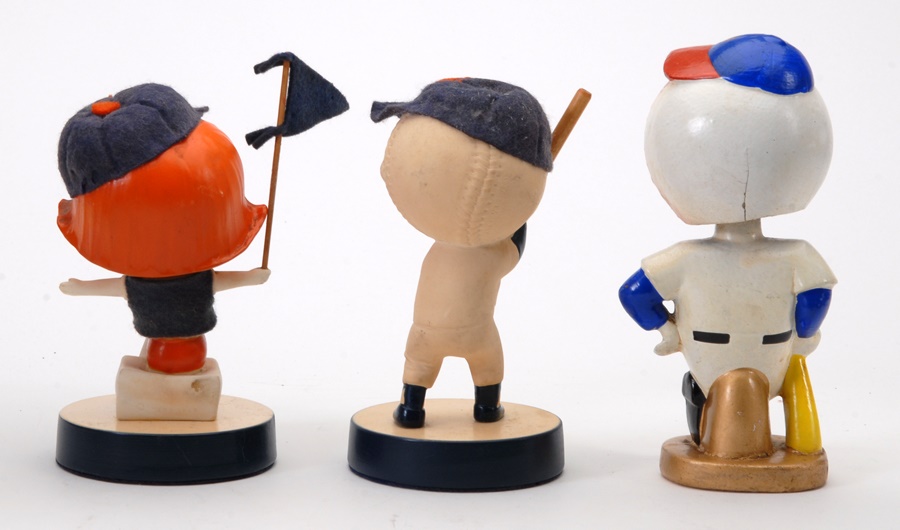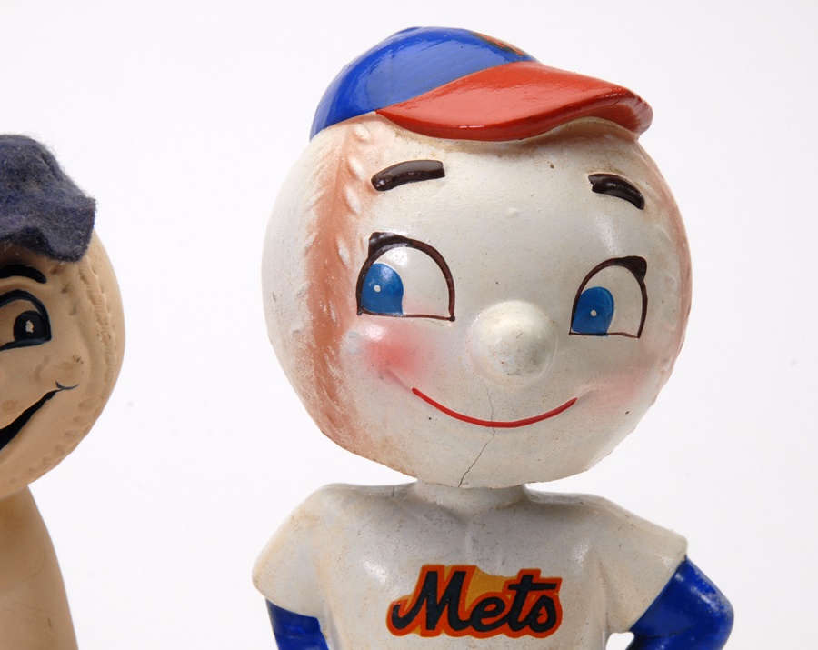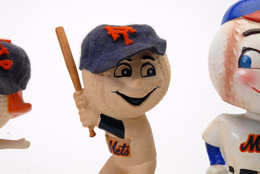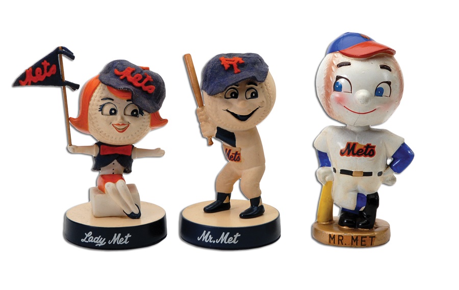 Step right up and Meet the Mets! This lot consists of three figurines featuring the team's mascot, Mr. Met, and his ladylove, Lady Met. Each stands approximately 7" tall, and there are three figures in all. One Mr. Met is a bobblehead, while the other two are not but are in the bobblehead "genre," each a plastic figure on a round base. The non-bobbleheads have great felt adornments in the form of Mets caps. The head of the Mr. Met bobble has a couple of small cracks, but these items rate in EX-NRMT condition.