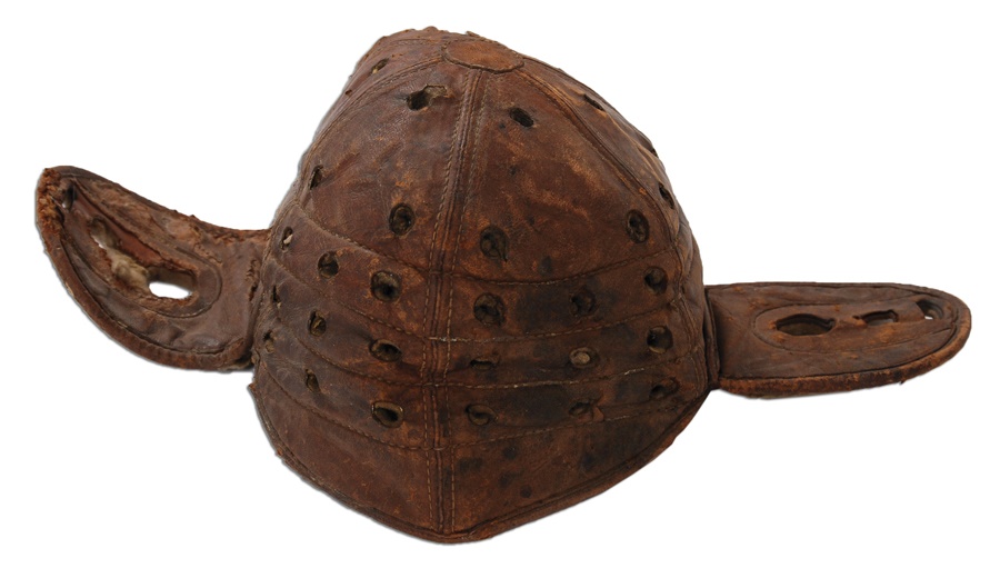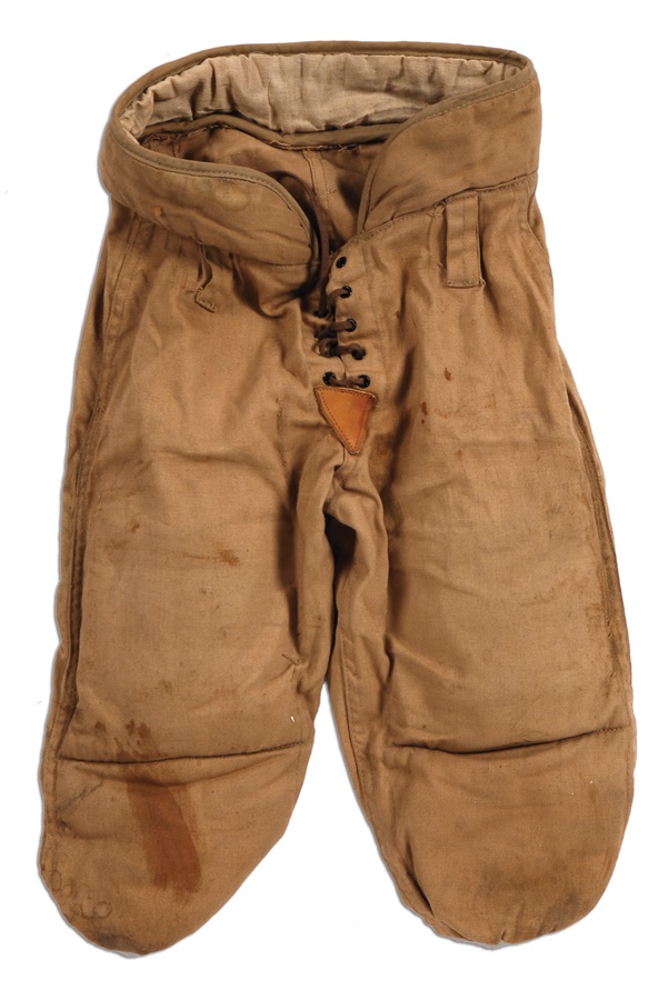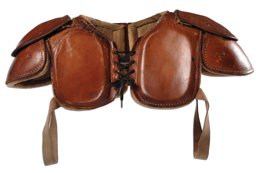 Talk about old school, the patent on this child's size football uniform dates back nearly a century. The three-piece set consists of a leather helmet, shoulder pads and football pants. The leather is in nice shape, especially the regal shoulder pads with Spalding marks & 1916 patent, though much of the stitching has come loose from the flaps on the pads on top of the shoulders on both sides. The helmet and pants are unmarked by manufacturer, and the pants come with insert thigh pads. These items show great use and in light of the age the set is overall in Excellent condition.