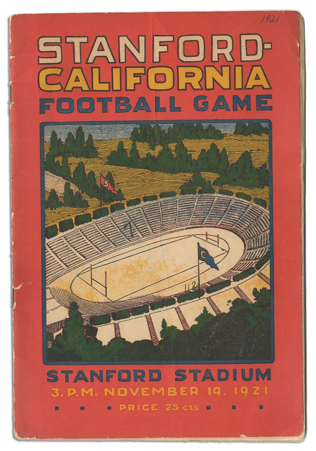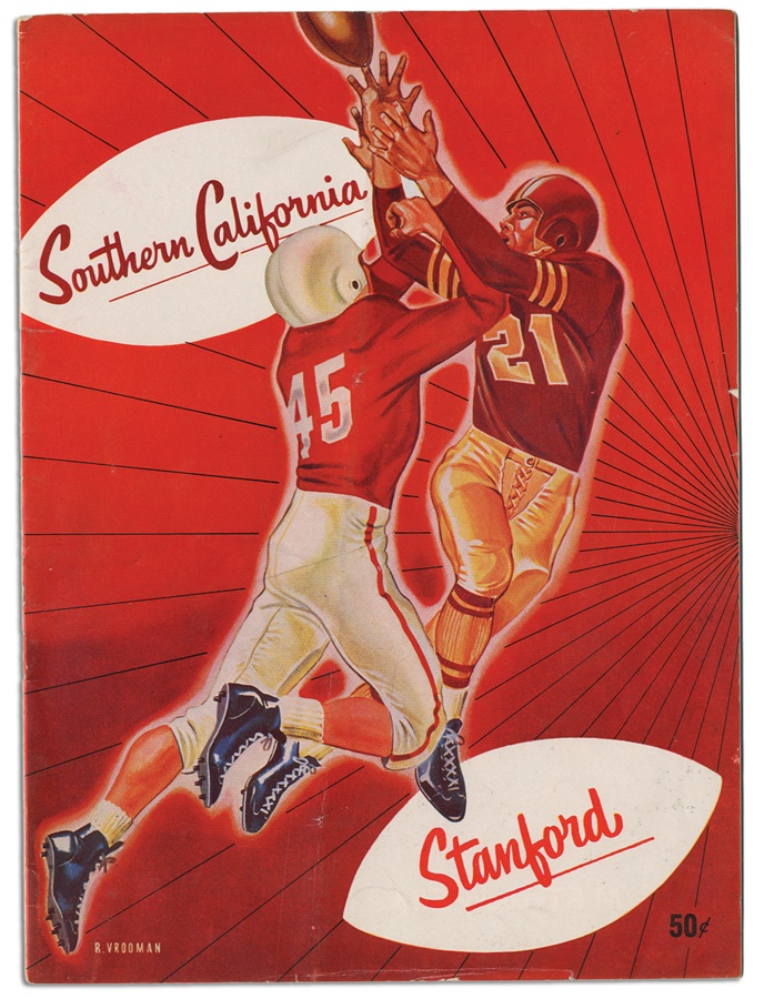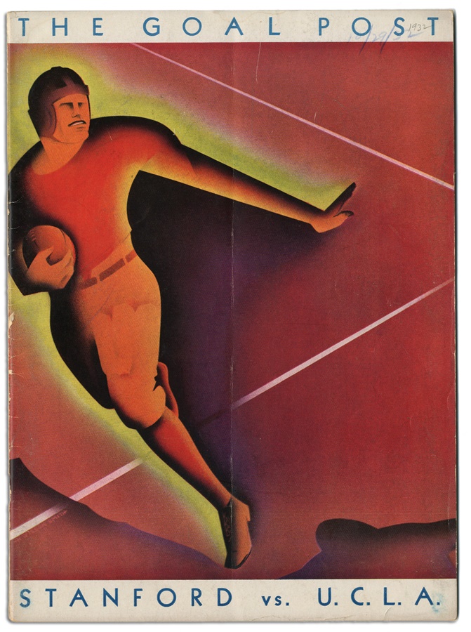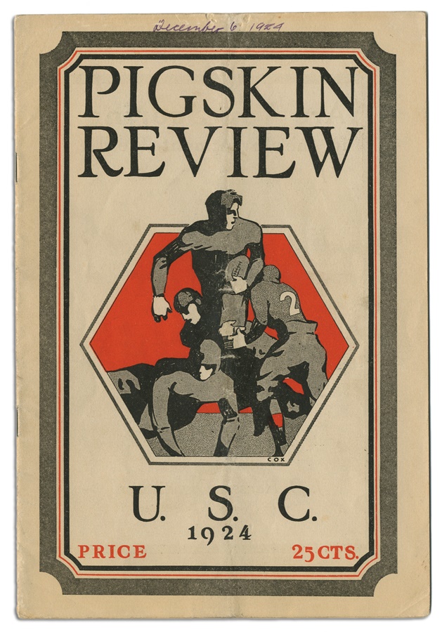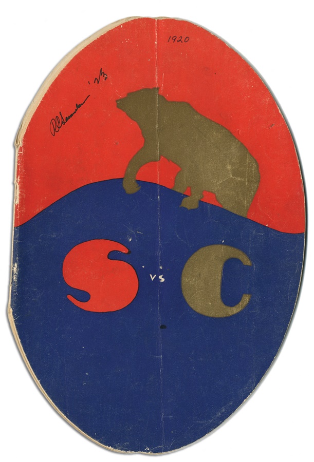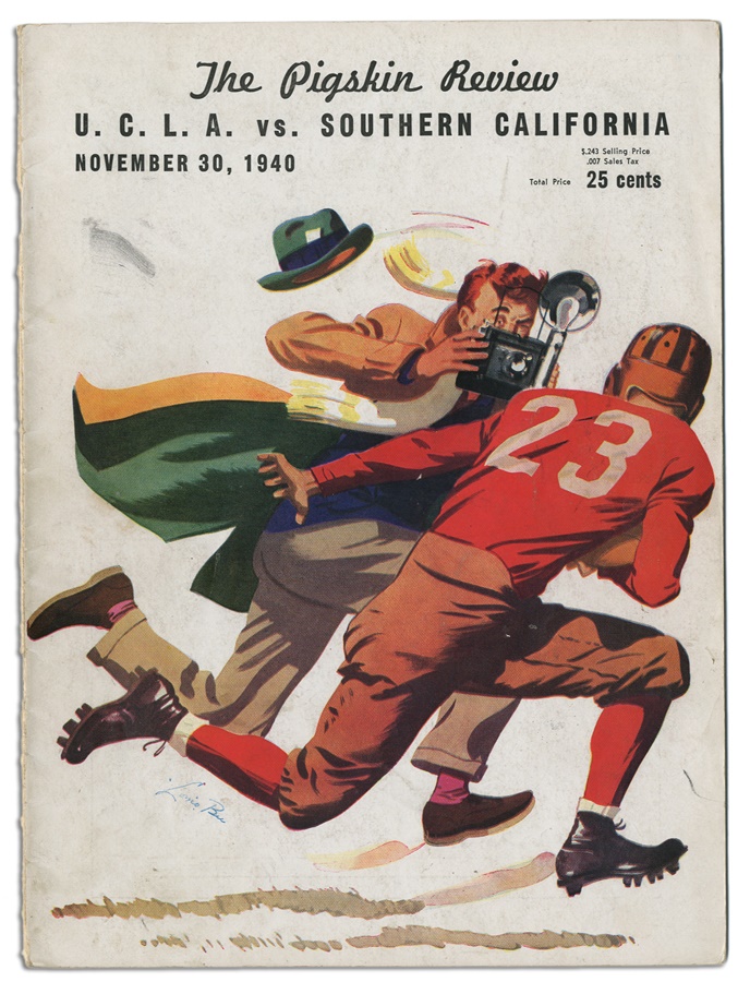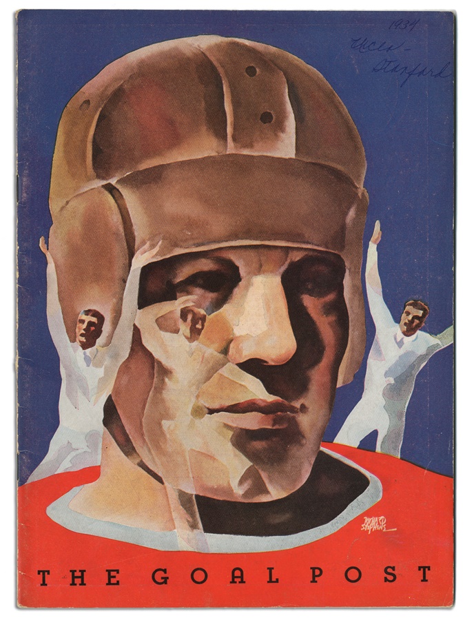 A wonderful look through some big games in California college football history is available with this lot of 14 vintage game programs. Included are: Pigskin Review, USC, December 6, 1924 (VG+); Stanford-California, November 19, 1921 (VG); Pigskin Review, USC, October 11, 1924 (some writing, otherwise EX); Stanford-Cal 1920 (GD-VG); USC-Notre Dame, Nov 25, 1933 (FR-GD); Stanford-Cal (Nov 21, 1936 (VG-EX); Stanford-USC Oct 27, 1934 (VG+); USC-Stanford (Nov 8, 1952); Stanford-USC, Oct 16, 1948 (Homecoming - NRMT); UCLA-USC, Nov 30, 1940 (EX); Stanford-UCLA, Nov 3, 1934 (EX+); Stanford-UCLA, Oct 29, 1932 (VG+); Stanford-UCLA, Oct 21, 1950 (NRMT); Oregon-Cal, Nov 3, 1928 (VG). A nice cross-section of publications from some of the great rivalries.