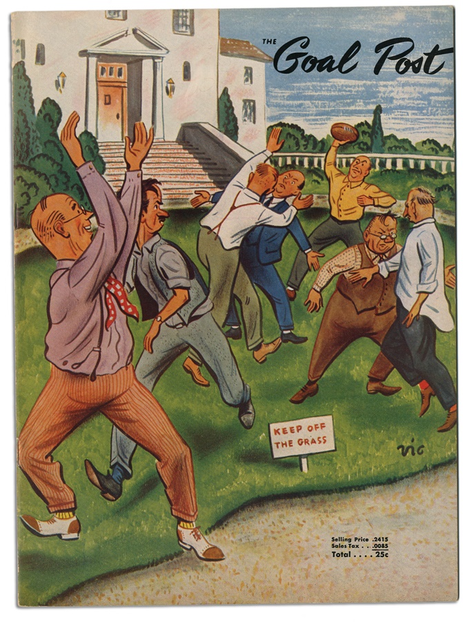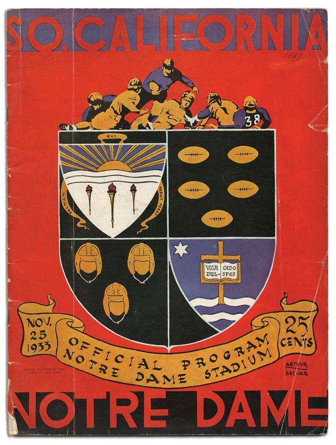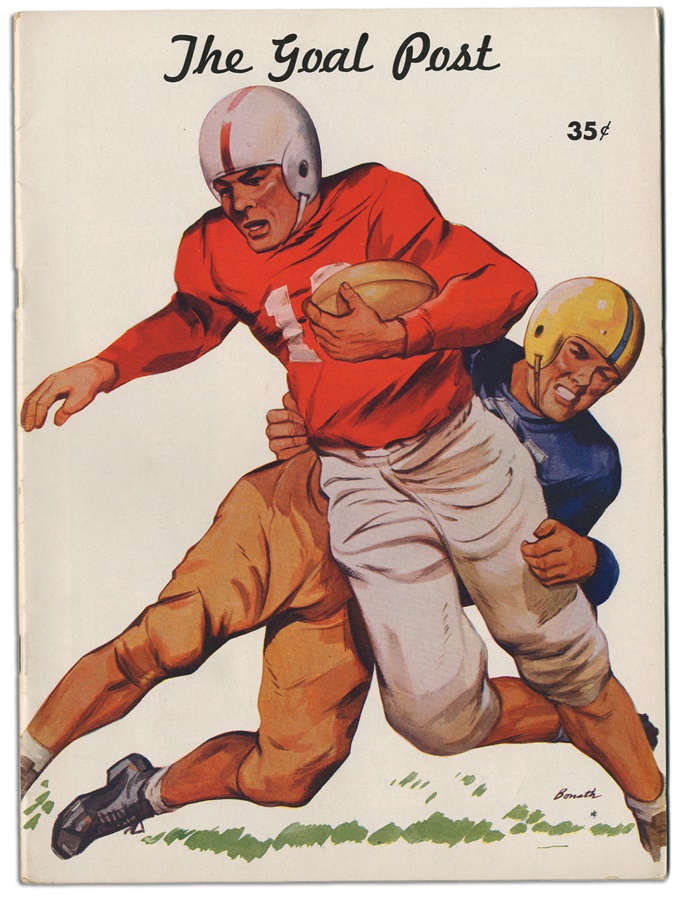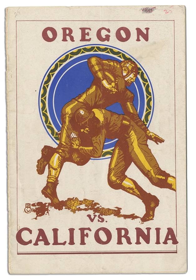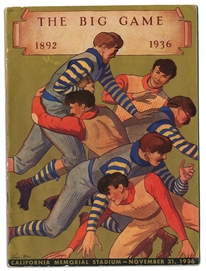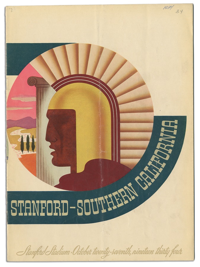 A wonderful look through some big games in California college football history is available with this lot of 14 vintage game programs. Included are: Pigskin Review, USC, December 6, 1924 (VG+); Stanford-California, November 19, 1921 (VG); Pigskin Review, USC, October 11, 1924 (some writing, otherwise EX); Stanford-Cal 1920 (GD-VG); USC-Notre Dame, Nov 25, 1933 (FR-GD); Stanford-Cal (Nov 21, 1936 (VG-EX); Stanford-USC Oct 27, 1934 (VG+); USC-Stanford (Nov 8, 1952); Stanford-USC, Oct 16, 1948 (Homecoming - NRMT); UCLA-USC, Nov 30, 1940 (EX); Stanford-UCLA, Nov 3, 1934 (EX+); Stanford-UCLA, Oct 29, 1932 (VG+); Stanford-UCLA, Oct 21, 1950 (NRMT); Oregon-Cal, Nov 3, 1928 (VG). A nice cross-section of publications from some of the great rivalries.
