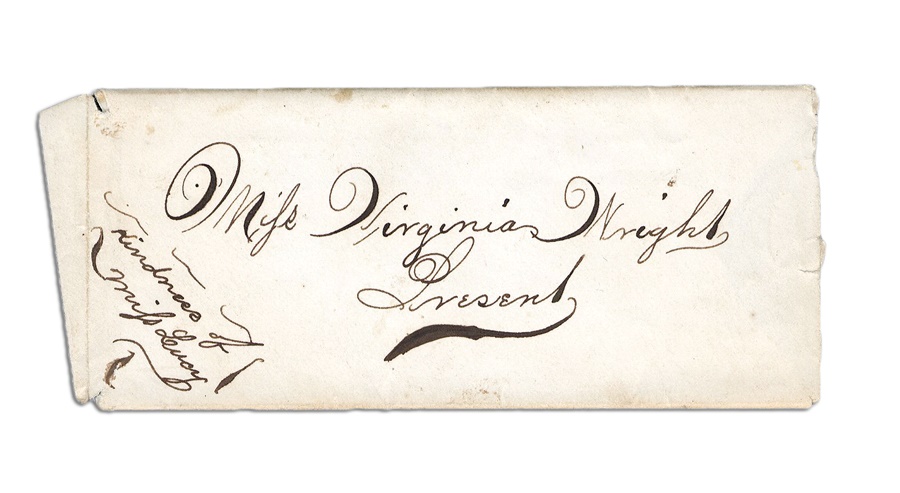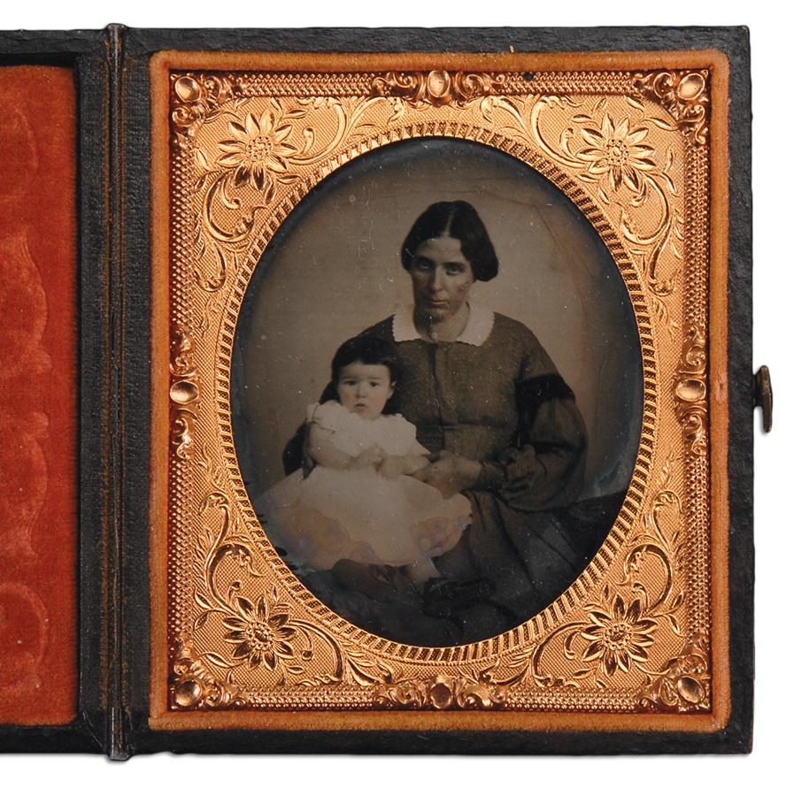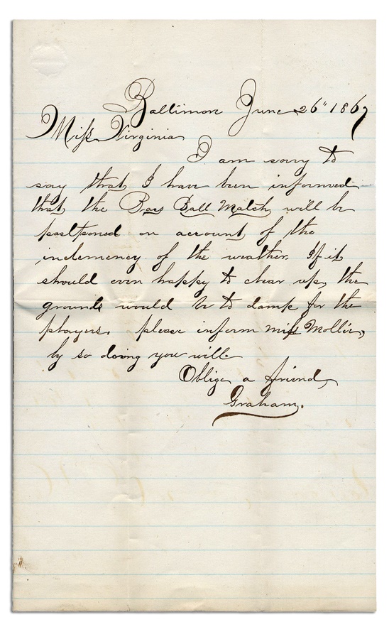 Contained in this lot is a fascinating letter in its original envelope written to Virginia Wright from "Graham," both of whom were either connected to the team or very serious cranks. It is dated June 6, 1869 from Baltimore and reads, "My Virginia, I am sorry to say that I have been informed that the Base Ball Match will be postponed on account of the indecency of the weather. If it should even happen to clear the grounds would be too damp for the players. Please inform Mrs. Mollin, by so doing you will. Oblige a friend, Graham." This comes with ambrotype in leather union case, we believe it to be Virginia Wright & child. Interestingly, she is wearing black mourning armbands.