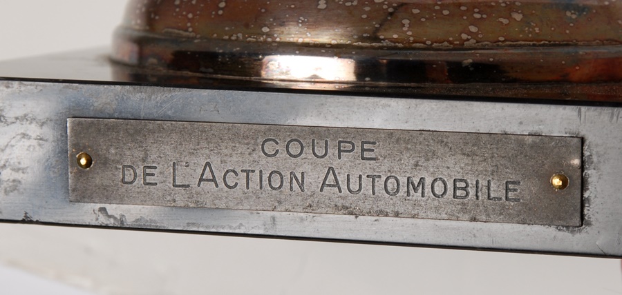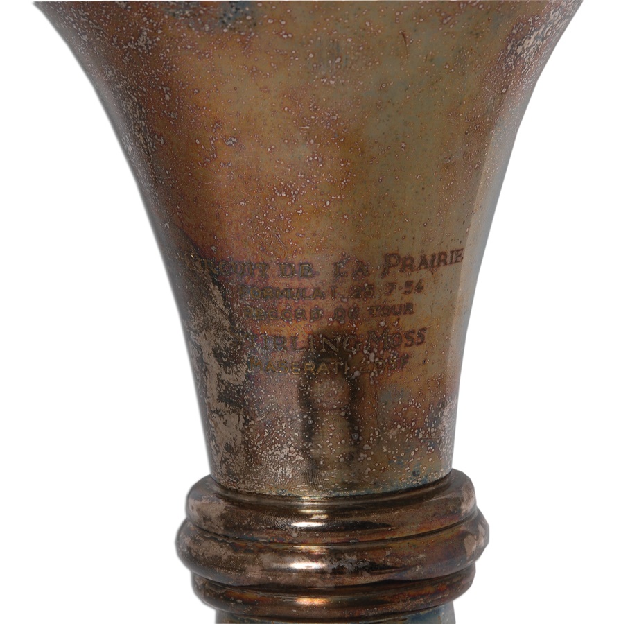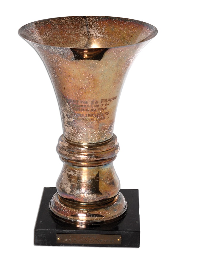 Winner of 16 Formula One Grand Prix's. Stirling Moss is one of the great drivers in history. Trophy is engraved:"Circuit De La Prairie...Formula 1 25.7.54...Record Du Tour...Stirling Moss...Maserati 205F." The base reads: "Coupe De Laction Automobile." Fine quality trophy originally came directly from Stirling Moss himself. Stands a little over 11 3/4" tall including base.
