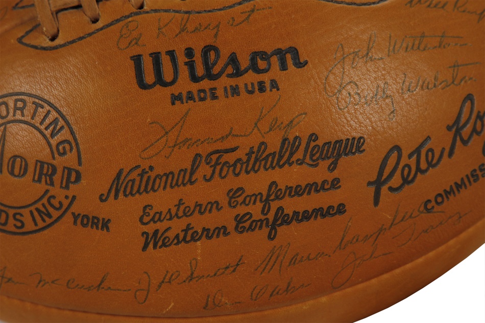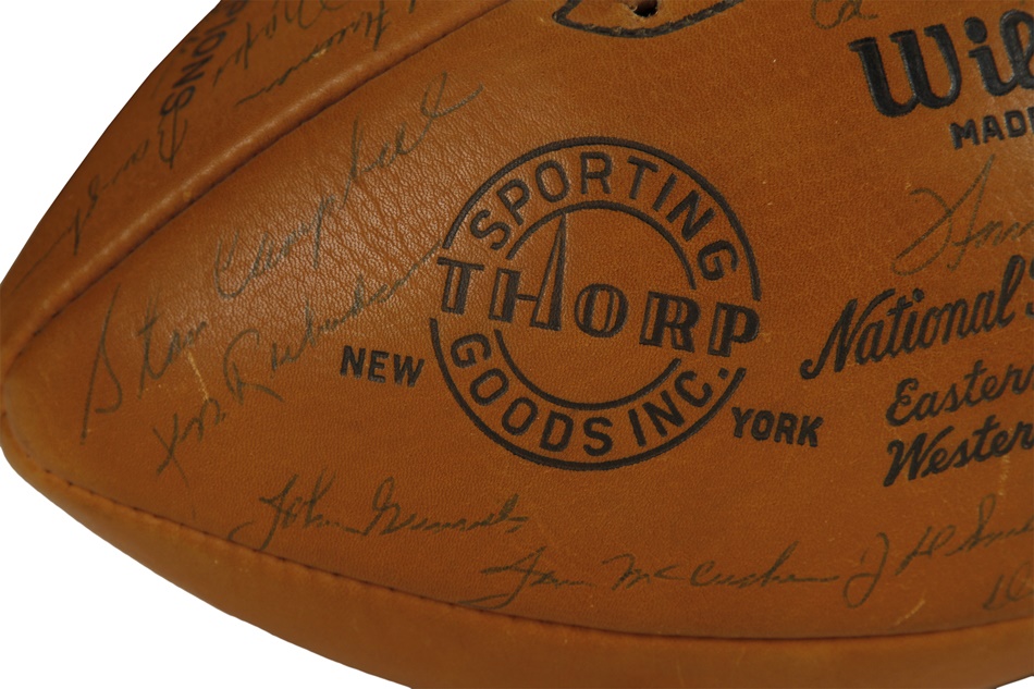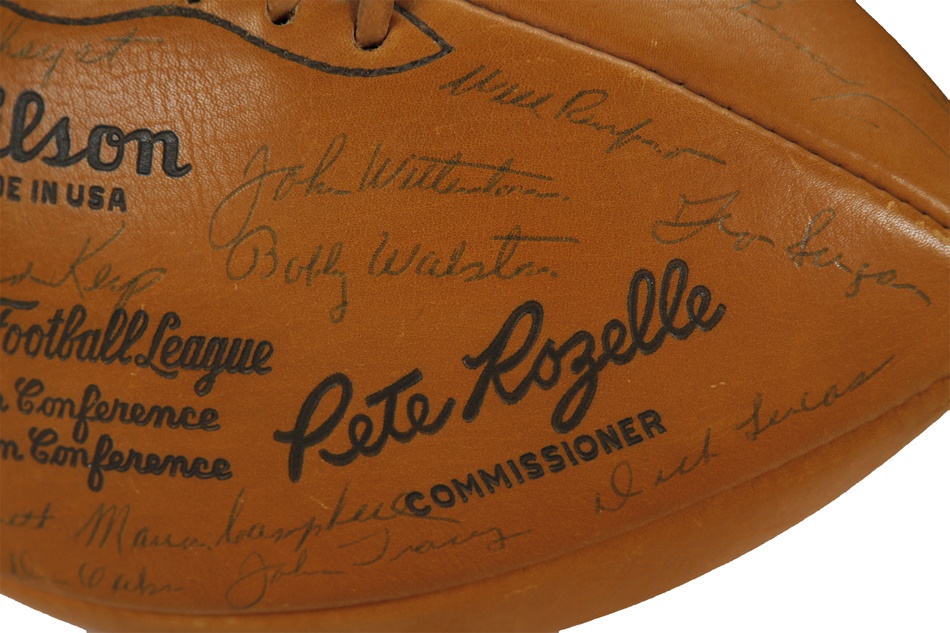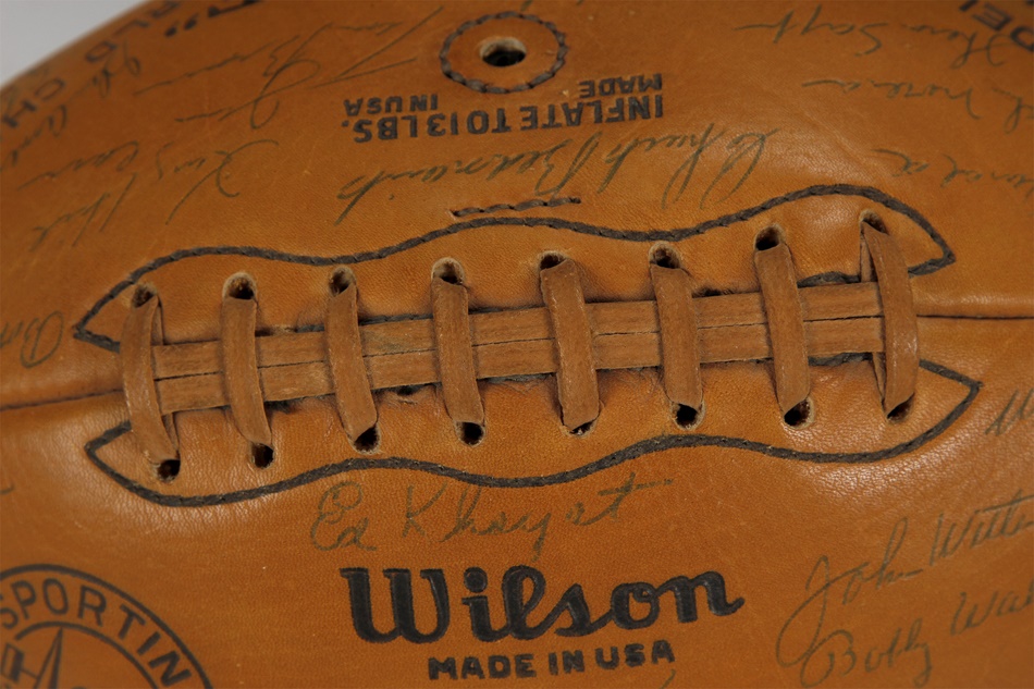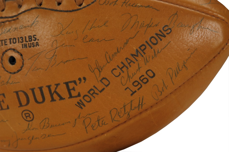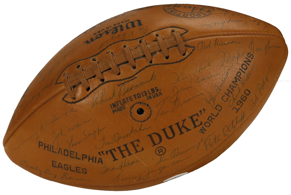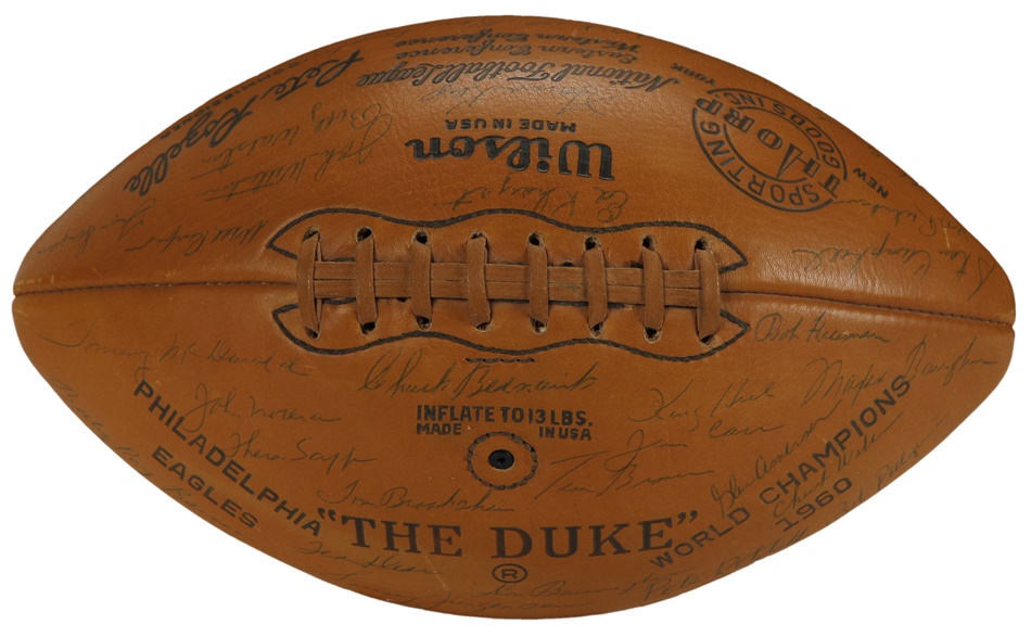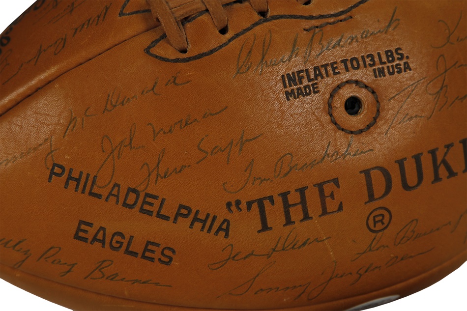 The Philadelphia Eagles bested Vincent Lombardi's Green Bay Packers for the NFL championship in 1960, and this gorgeous ball features 34 bold signatures from members of that outstanding team. Among them are Hall of Famers Sonny Jurgensen, Tommy McDonald and Chuck Bednarik, who became renowned for knocking Frank Gifford of the New York Giants out of football for over 18 months in one of the most famous tackles in NFL history. Bednarik - one of the true iron men the game has ever seen - was the last man to play the entire championship game. He averaged 58 minutes a game, playing both sides of the ball. On the last play of the championship game, Bednarik tackled Jim Taylor on 7-yard line and lay on top of him as he fought to get up as clock tick off final seconds. Philadelphia won 17-13 to cap an 11-2 season. This football is NRMT to MINT and comes with an LOA. The Eagles had won two titles prior to that 1960 campaign, the last occurrence being 11 years earlier. It would be 1978 before the franchise would ever play another postseason game.
