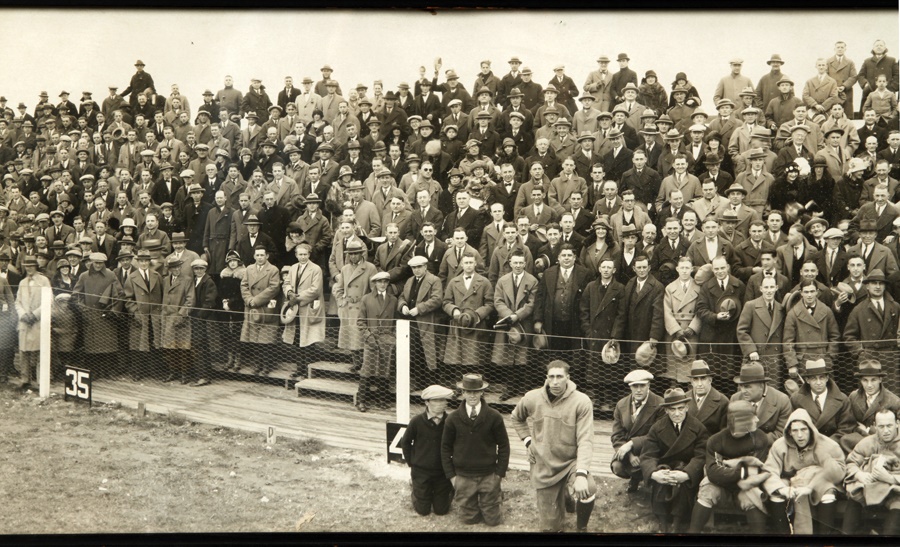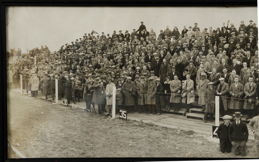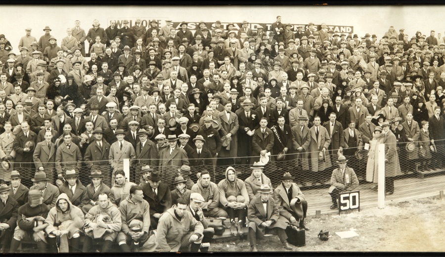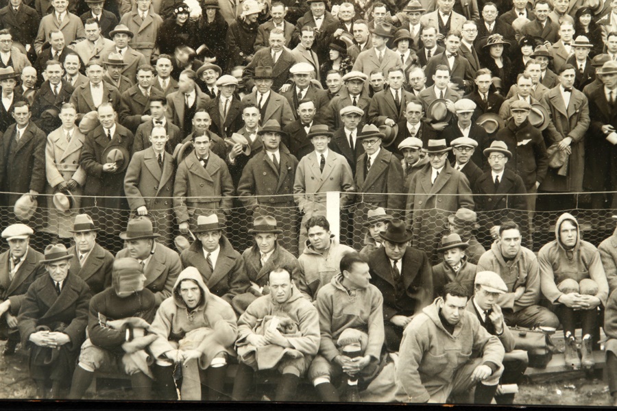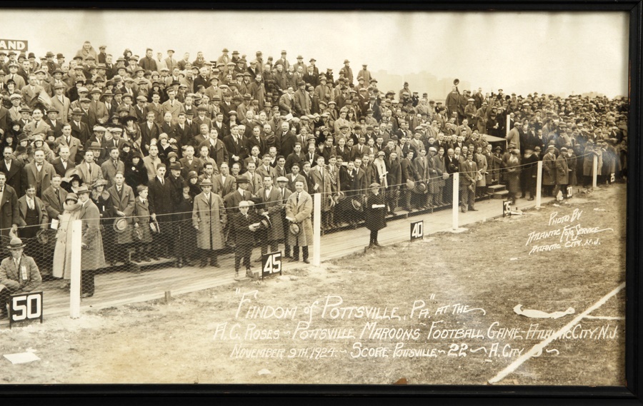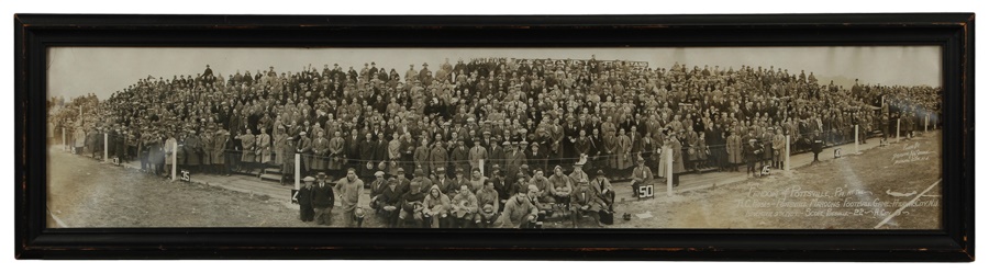Taken in Atlantic City as the Pottsville Maroons and Atlantic City Roses battled on the gridiron, this 45" x 11" panoramic depicts the last game the team played before joining the National Football League the following season. Based in a sleepy coal-mining town in Pennsylvania, the Maroons traveled to Atlantic City along with buses filled with their fans to make a statement to NFL president Joe Carr that they had a fan base worthy of NFL membership. Photo appears EX and is in a period frame. The wording on the far right reads: "FANDOM OF POTTSVILLE, PA" AT THE A.C. ROSES - POTTSVILLE MAROONS FOOTBALL GAME - ATLANTIC CITY, N.J. NOVEMBER 9th 1924 - SCORE-POTTSVILLE 22-ATLANTIC CITY 0. There is also a photo credit to Atlantic Foto Service of Atlantic City, NJ.