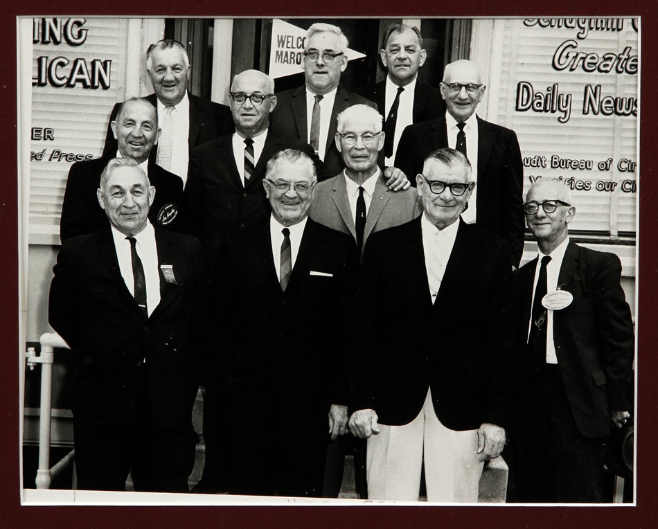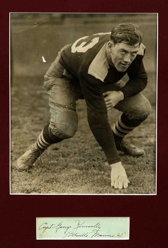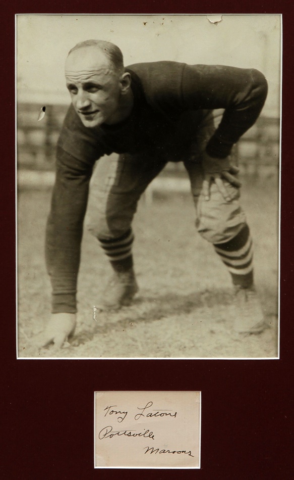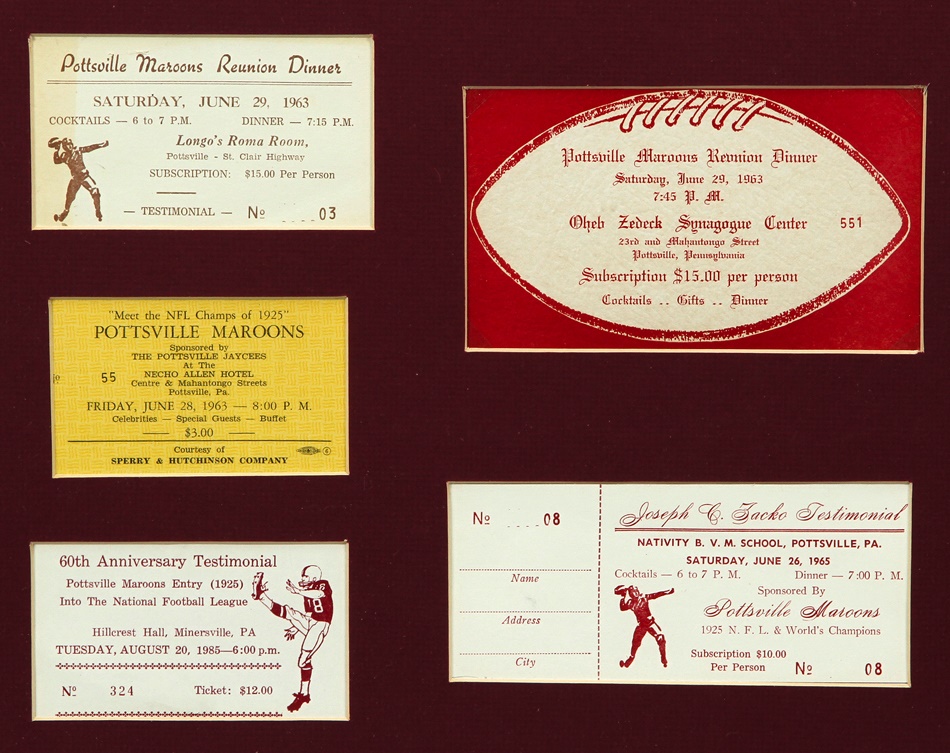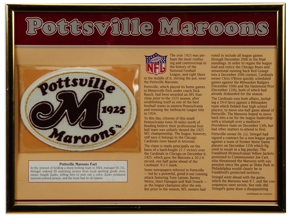 One of the NFL's early star-crossed franchises, the Pottsville Maroons appeared to have won the 1925 championship. only to have it rescinded due to a controversial suspension. Most of these framed photos come from the collection of longtime Maroons booster, Joseph Zacko. Some nice original photos, group of tickets from the the team reunions and a more recent patch. Best of the lot are two signatures framed with photos. One is of star player Tony Latone and the other of George Kenneally. Overall EX condition.