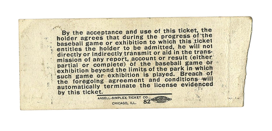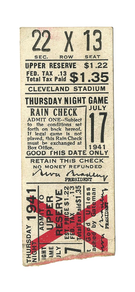 Here's an extremely rare ticket stub, the holder of which saw first-hand Hall of Fame legend Joe DiMaggio's record 56-game hitting streak come to a conclusion. Dated July 17, 1941, it was good for an Upper Reserved seat at Cleveland Stadium that misty night, when a season-high 67,463 fans witnessed history. Technically, the condition is VG-EX, but it looks much better, and is larger than the others we have seen, making it a bit more desirable. DiMaggio's streak could have easily extended on this particular date, as the Yankee Clipper was robbed twice by Gold Glove third baseman Ken Keltner, who snared two blistering ground balls down the third-base line, destined to be doubled for "Joltin' Joe." Instead, they were bang-bang plays at first base, and DiMaggio was forced to settle for an 0-3 with a seventh-inning walk against Tribe ace Bob Feller. After a 6-4-3 double play in the eighth, the streak was over, although the Yankees still won the game. And, oh by the way, Joe D hit safely in the next 17 games!