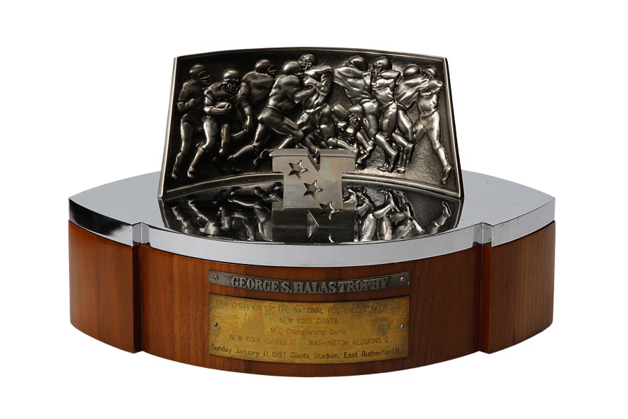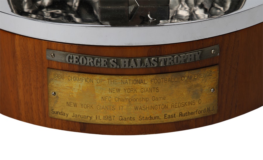 George Halas' contributions to the game of football are invaluable and eternal. As a player, coach, owner and executive (of which he mastered all four), he was a true standout. And he played for one of pro football’s most famous franchises. As a coach, he was responsible for signing the Galloping Ghost, “Red” Granger, and he recorded an astounding 321 career wins as a coach! How fitting that the award named after him be reserved for arguably the most courageous player in football. The trophy is an appropriately beautiful, impressive work of art. The foundation is solid oak carved into the shape of a football with the top and bottom surfaces being flat. The bottom is lined with black felt. One of two plates attached to the front of the wooden part is raised lettering which reads, “GEORGE S. HALAS TROPHY.” The plate below is engraved with “1986 CHAMPION OF THE NATIONAL FOOTBALL CONFERENCE - NEW YORK GIANTS - NFC CHAMPIONSHIP GAME, NEW YORK GIANTS 17 - WASHINGTON REDSKINS 0 SUNDAY JANUARY 11, 1987, GIANTS STADIUM, EAST RUTHERFORD N.J." The top surface is perfectly smooth and flat with two ornaments mounted. One is a sculpture of 10 football players in action against a concave wall. The other is a block letter “N” (.75” thick and 2.5” wide) with three stars stamped on both sides. The trophy measures 8.25” from base to highest point, 10” wide (middle of football), and 16” long. EX-NRMT condition. This is an extra trophy, identical to the one awarded to the Giants, who posted a dominant 14-2 regular-season record before blowing through the playoffs, outlasting the Denver Broncos for their first Super Bowl title.