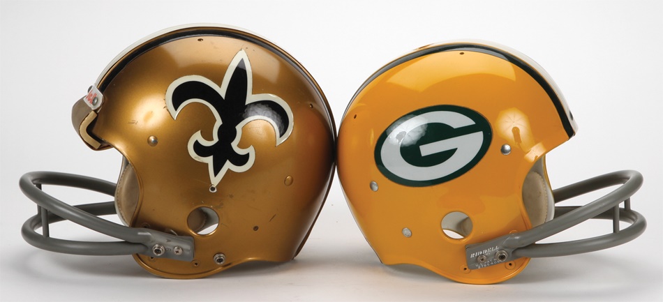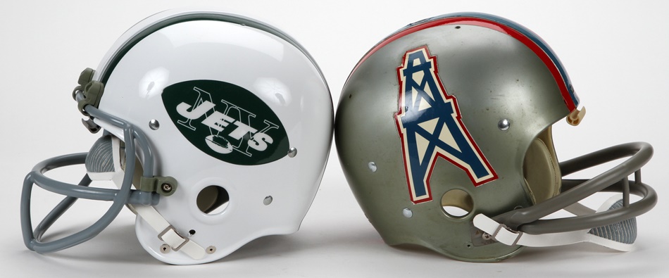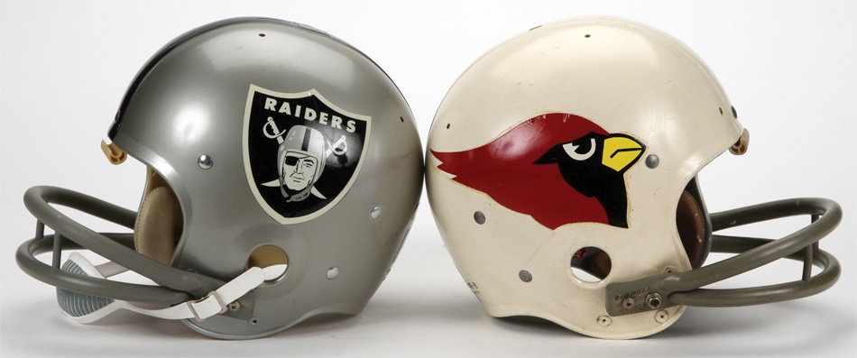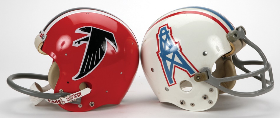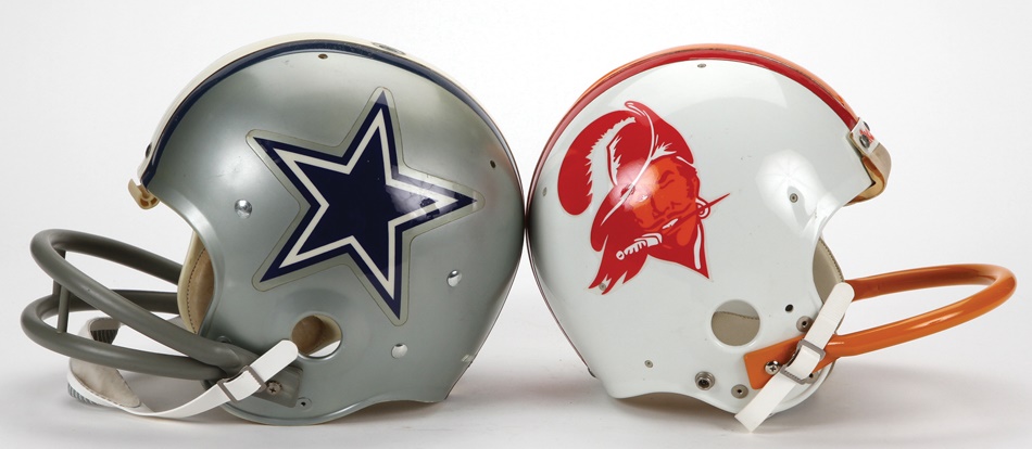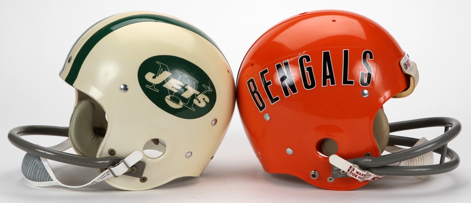 Here's a very nice collection of NFL helmet styles. A few of these classics were used but most are unused and have some old and new components. The 1970s-style Riddell suspension helmets include: New York Jets (old shell, new guts, no use); New York Jets replica; Houston Oilers (new guts, old shell); Dallas Cowboys (new guts, Staubach name put on back for display, not used by him); Cincinnati Bengals (older replica); Chicago Cardinals (game-used, number 42 on back; New Orleans Saints (older helmet which shows some light use); Green Bay Packers (older shell, no guts); Oakland Raiders (older shell and guts, number 25 on back but does not appear to be used); and Houston Oilers (older guts and shell but not used). Others include a 1980s-era Atlanta Falcons (number 6 on back but no real use); 1980s Tampa Bay Buccaneers (kickers helmet which looks to have some light use), Cincinnati Bengals (size 7.5 on guts) and 1999-2000 Buffalo Bills (game-used with #65 written inside). A great collection for display!