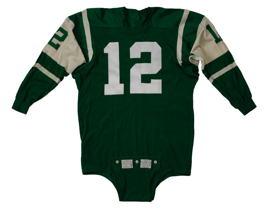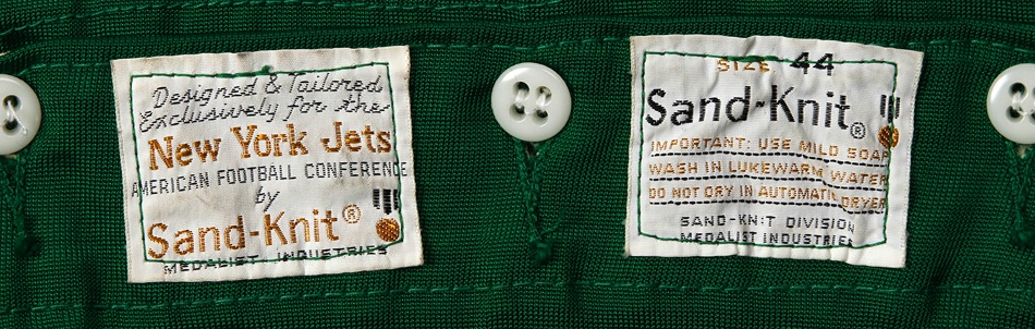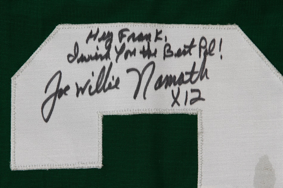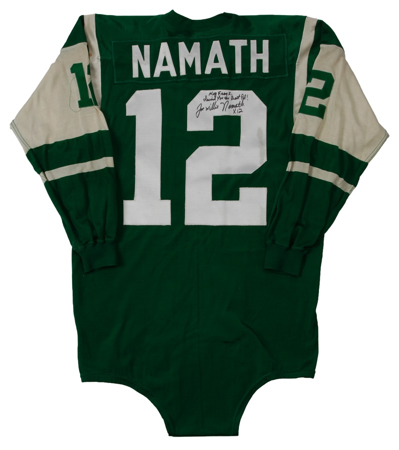 Joe Namath famously predicted his Jets would upset the favored Baltimore Colts in Super Bowl III, and he lived up to the hype. This pro model jersey belonging to "Broadway Joe" is very similar to the jerseys that he wore in games. It was obtained from Thorpe Sporting Goods during the early 1970s. The only differences are the cuffed sleeves and size. Number 12 is on the front, back, and both sleeves. Sand Knit size 44 and New York Jets tags are sewn on the crotch piece. "NAMATH" is sewn on a nameplate on the back. It is signed and personalized on the back number. Although this was never worn by Namath, it makes a great display at a fraction of the cost of a game-used jersey.