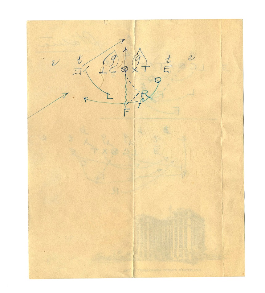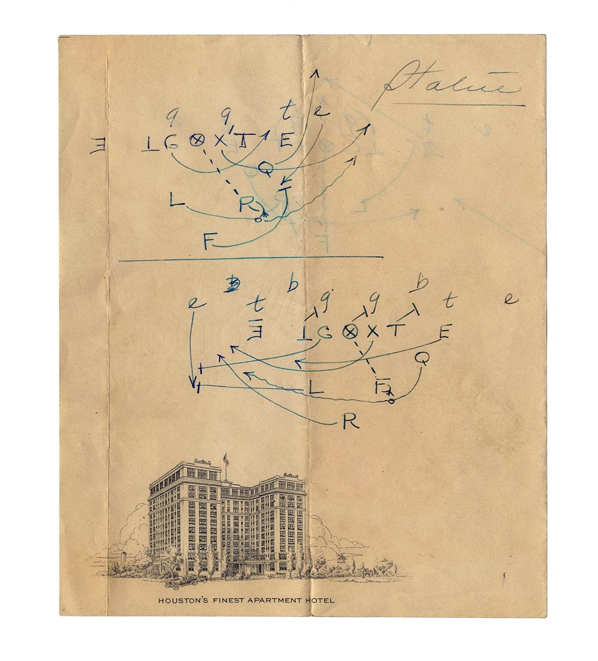 Perhaps the most widely-known trick play in American football, the Statue of Liberty is so-named due to the quarterback's arm position as he pump-fakes down the field before dropping the ball from over his head to a running back or wide receiver in motion behind him. Invented by John Heisman, the famous play was "drawn up" from his very own archives and this hand-drawing on stationery from Houston's Finest Apartment Hotel is labeled at the top "Statue." Another play is drawn on the back of this sheet. Writing is 8/10 while the 6" x 7" sheet of paper has folds but no tears. John Heisman, for whom the famous trophy annually honoring the top college player is named, coached 35 years at the college level and led Georgia Tech to the national championship in 1917.