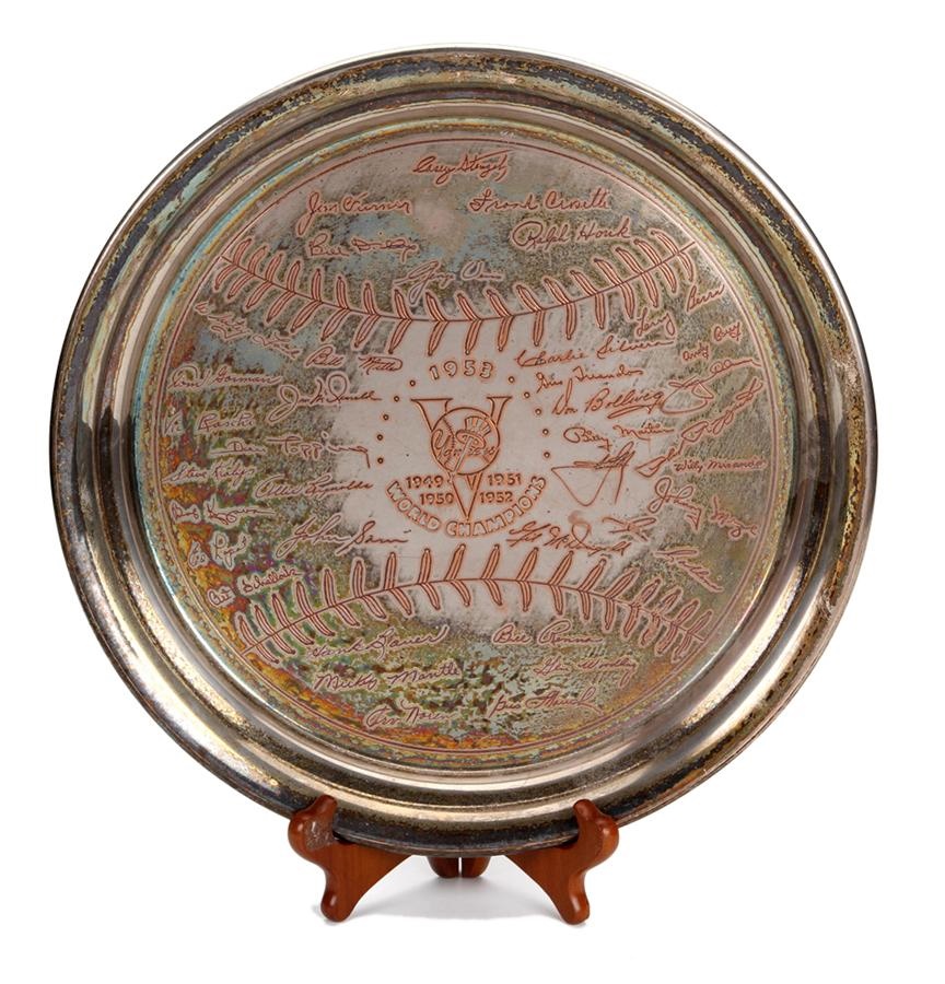 This 13” silver tray was created as a presentational item for the Yankees' fifth championship in as many years, and three of which came against the rival Brooklyn Dodgers. There are 37 engraved signatures including Mantle, Rizzuto, Berra, Mize, Crosetti, Stengel and Martin, surround a team logo and “1953 World Champions.” Etched with stitching details, the tray is noticeably tarnished, though otherwise EX. It was presented exclusively to players and team officials. The five straight World Series crowns remains a major league record.