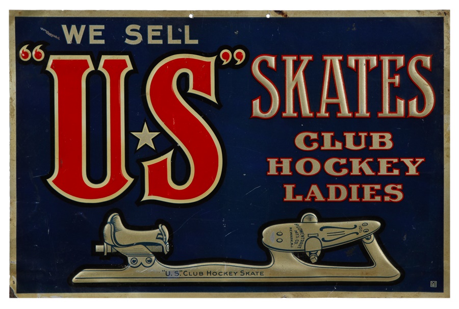What a terrific metal sign this is, dating from the turn of the 20th century. It reads: "WE SELL US SKATES CLUB HOCKEY LADIES" and features an illustration of a 13"-long ice skate with "P. LOWENTROUT MFG CO. NEWARK, NJ" written on it. The sign measures 17.5" x 11.5" and despite some minor bends on the edges, it is in VG condition.