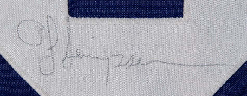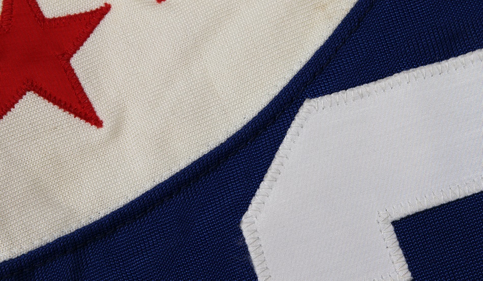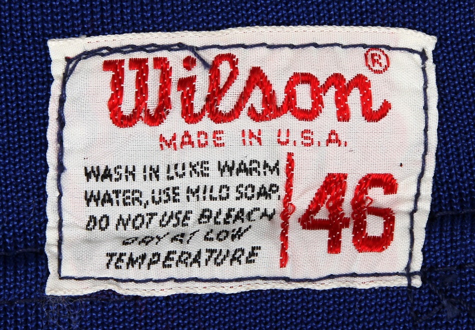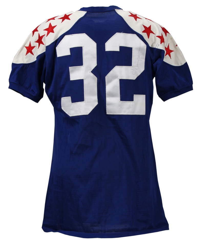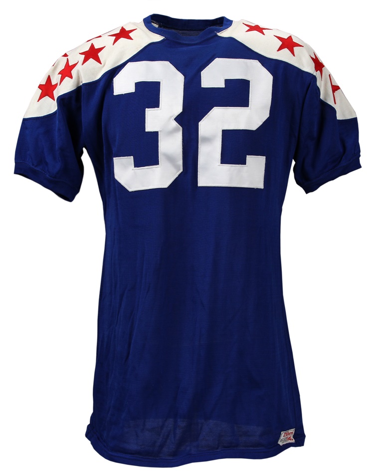 The now-infamous Simpson was supposed to have been on the 1969 All-Star team, and this jersey was made for him to wear in the game. However, it was reported that insurance for Simpson could not be obtained for the game, thus he did not play. "32" is on the front and the back with red stars on the shoulders. Vintage signed in blue ballpoint on the number "2" on the back. Wilson size 46 tag on the front tail. No use, obviously. "Juice" was a peerless running back at his Alma Mater, USC, and then with the Buffalo Bills, where he became the first pro player to rush for 2,000 yards in a season... a feat that's all the more amazing considering that the time he achieved it in 1973, the NFL season consisted of just 14 games.