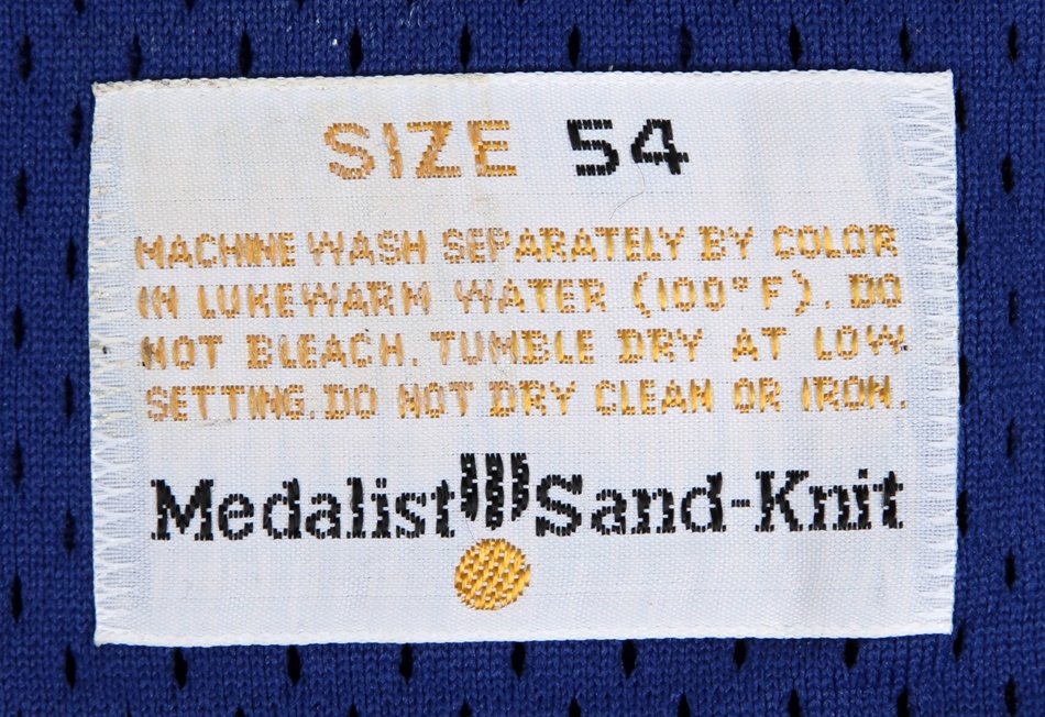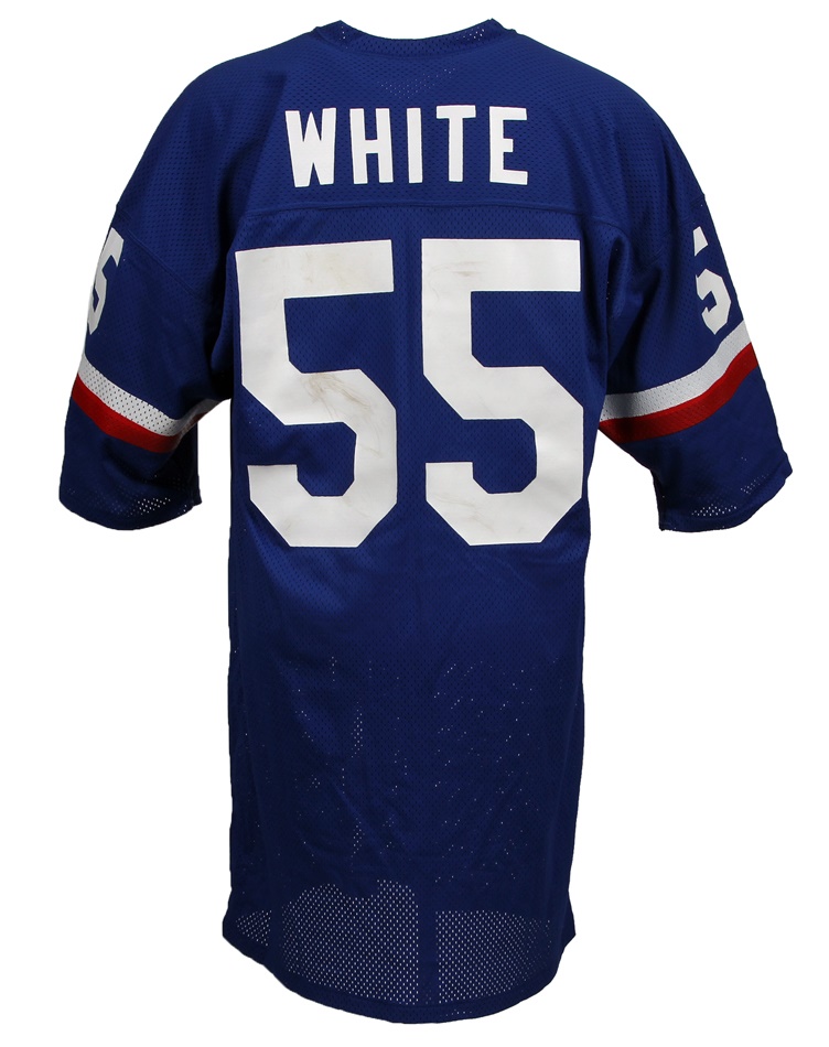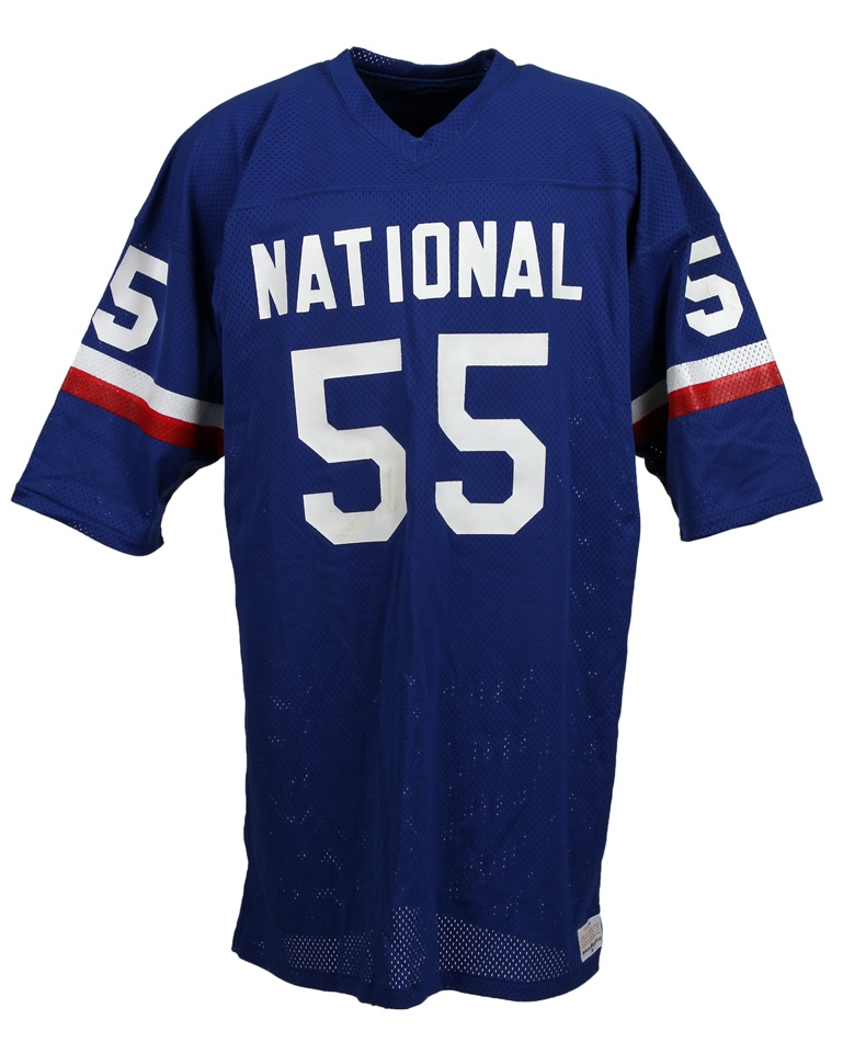 Nine-time All-Pro quarterback Randy White was named Co-MVP of the Super Bowl in 1978, guiding his Dallas Cowboys past the Denver Broncos. This was his jersey during one of his many Pro Bowl appearances, and it shows light use with slight scuff and dirt marks. "55" is heat-pressed in white on the front, back and both sleeves. "WHITE" is heat-pressed directly onto the back of the jersey while "NATIONAL" is on the front. Medalist Sand Knit size 54 tag is on the front tail. Originally obtained from former NFL equipment manager, Don Hewitt. White has been inducted into both the pro and college football Halls of Fame.