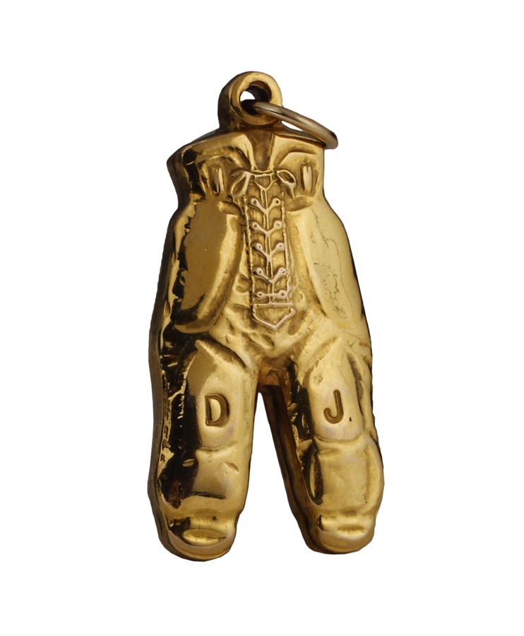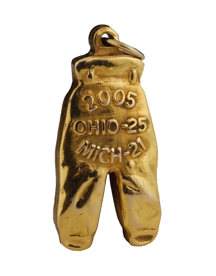 Ohio St and Michigan engage in one of the fiercest rivalries in all of sports. To commemorate every victory over the hated Wolverines, the Buckeye football program awards its players with a "Gold Pants" charm. This tradition dates back to 1934 when OSU head coach Francis Schmidt founded the "Pants Club." Here we have fullback Dionte Johnson's NRMT Gold Pants charm from 2005. The face reads "2005 Ohio-25 Mich-21" and the reverse has his initials "DJ" engraved on each leg.