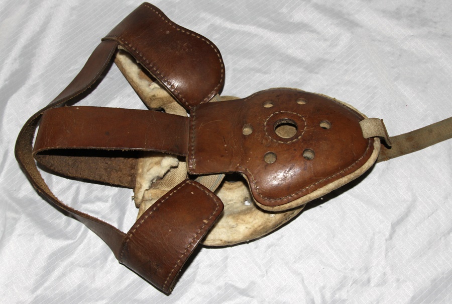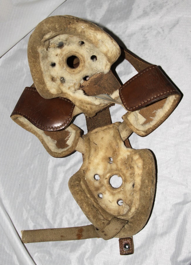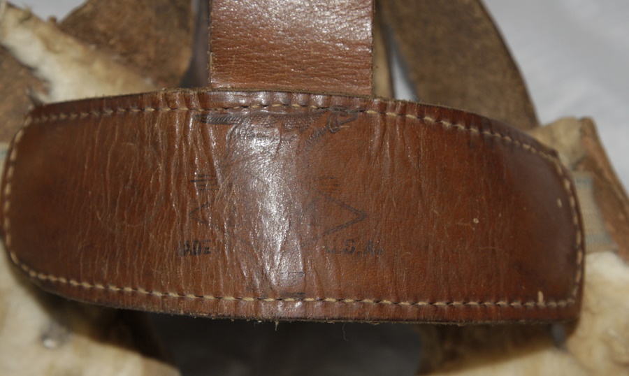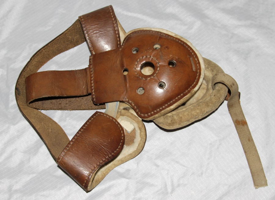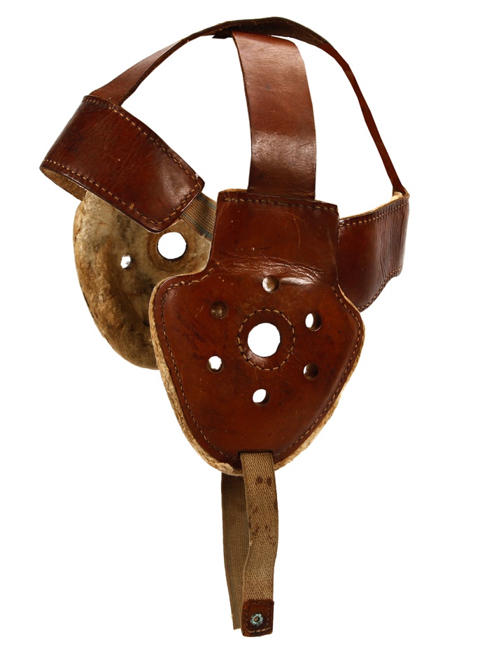 The evolution of the football helmet over the last century has been swift and drastic. This early football relic is in EX condition with most of the padding and the chin strap still intact. The maker, Draper and Maynard, has its logo engrained on the front strap. It's rare to see these helmets in such good shape.