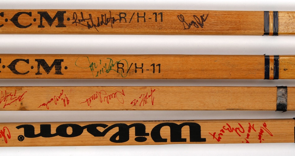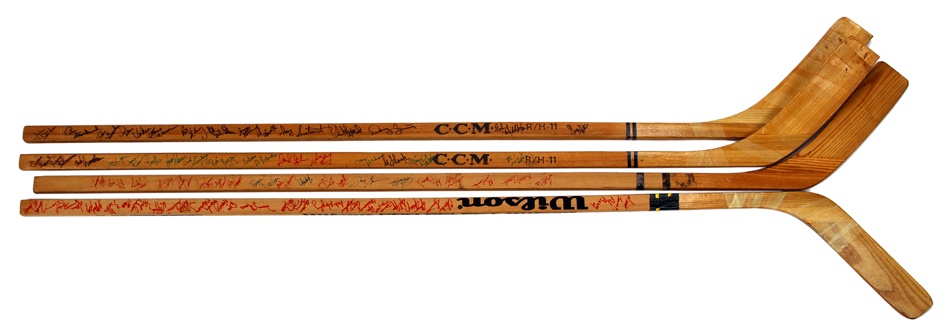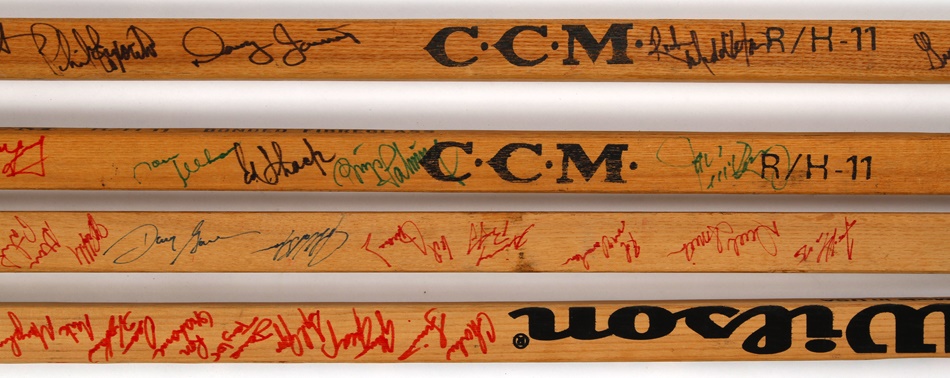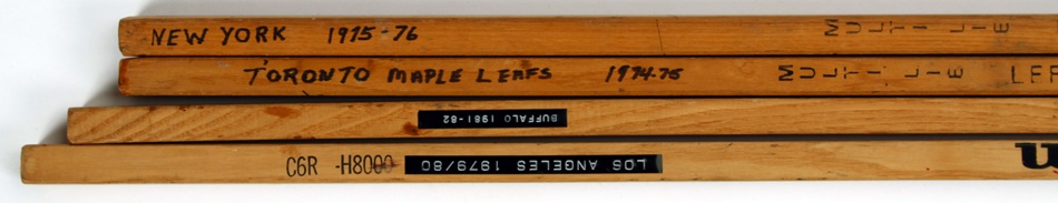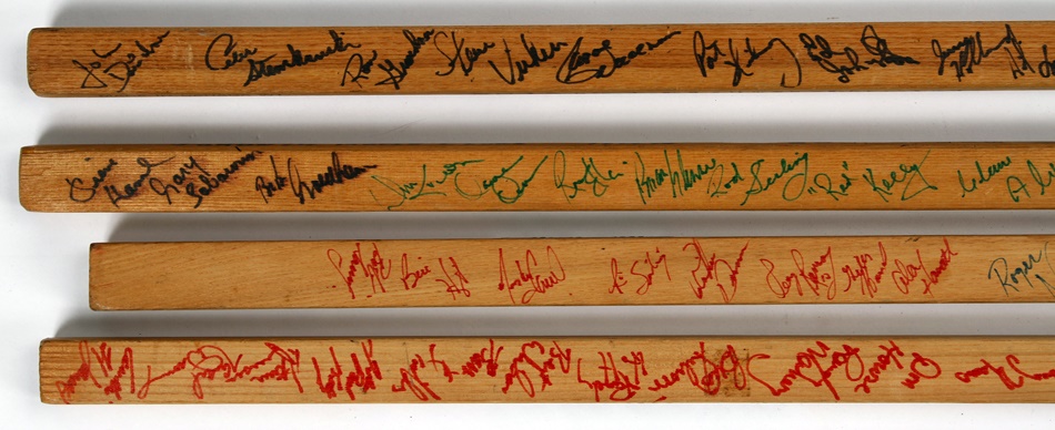 Here we have a great set of team-signed sticks. Included are: 1974-75 Toronto Maple Leafs with 16 signatures; 1975-76 New York Rangers with 15 signatures; 1979-80 Los Angeles Kings with 20 signatures; and 1981-82 Buffalo Sabres with 20 signatures. Most of the key autographs are included on the sticks with plenty of Hall of Famers. Sticks themselves are EX or better condition while signatures in felt tip pen average 8/10. All signatures were obtained in person. Very nice collection.