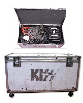 Here is a unique chance to own an official KISS stenciled microphone hard shelled carrying road case filled with fourteen assorted microphones. The Shure SM58 vocal was used by Gene as indicated with "tape names," as well as one for Paul, backups for Gene, Paul, Bruce Kulick and Eric Singer along with technical notations and micro-phones for Gene. The second case is a cable trunk filled with extension cables, console snake, speaker wires and mike stands (25x51x24"). Estimate $600-$900.
