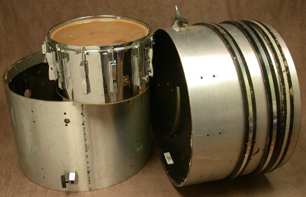 Includes original Ludwig chrome snare drum (15x9"), and two 24" Ludwig bass drum shells. Estimate $200-$300. Resonate snare, chrome finish no bottom head. Floor Ludwig bass drms with Kiss inventory barcode, no hardware and three wood rims. Serial #2010778.