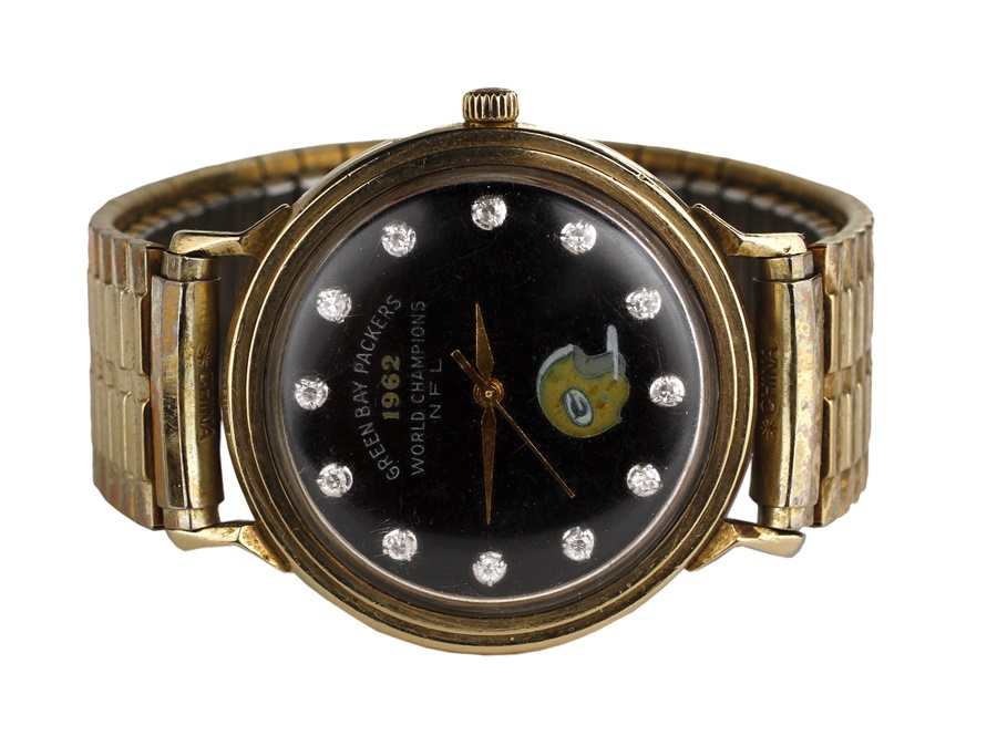 The 1962 Green Bay Packers, under the guidance of legendary coach Vince Lombardi, went 13-1 and defeated the New York Giants to capture their eighth NFL championship. This commemorative watch was inscribed on the back and presented to Tom Miller, who played for the club in 1946 but was an executive with the team in 1962. The watch has some scuffing and does not work, but it's still a dazzling piece of jewelry, a 14k gold Hamilton watch featuring team logo on the face with small diamonds serving as the numbers, as well as “Green Bay Packers 1962 World Champions N. F. L.” inscribed. The back of the watch has “Tom Miller - Green Bay 16 – New York 7” inscribed.