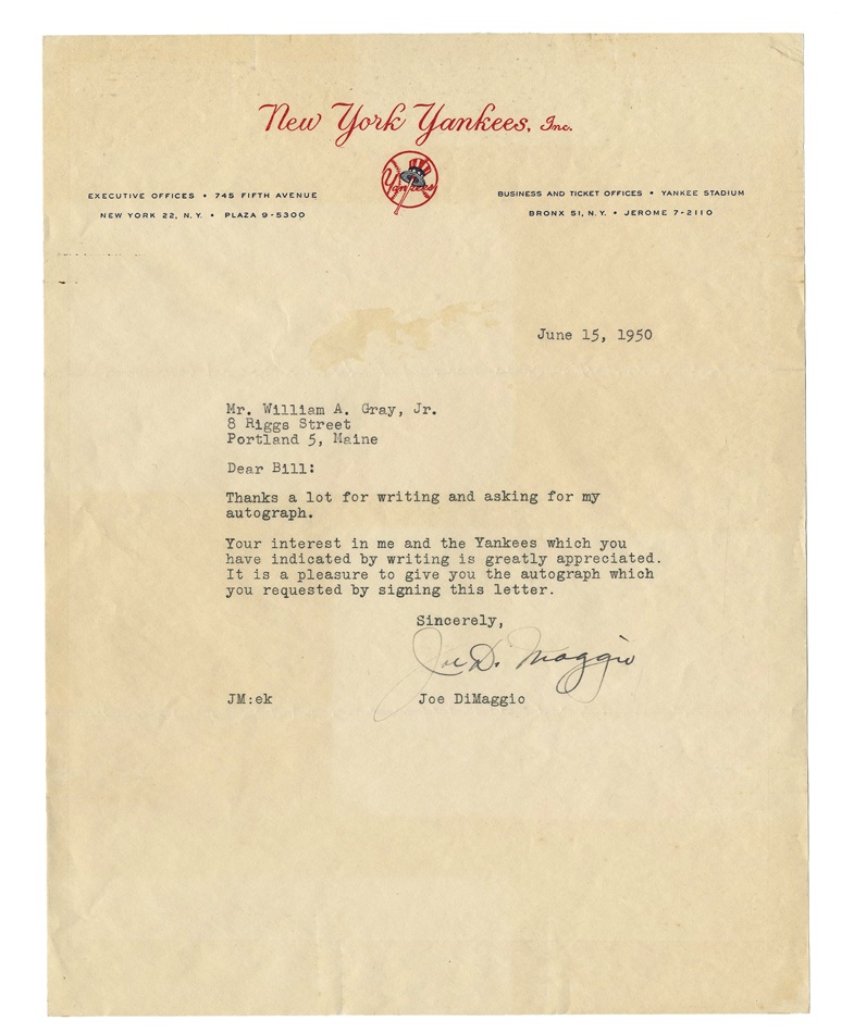 Joltin' Joe DiMaggio's last truly productive season was in 1950, when he helped the Yankees to another World Series championship over the "Whiz Kids" Phillies. The Hall of Famer batted .301 with 32 home runs, 122 RBI and an AL-best .585 slugging percentage. But when he wasn't punishing the ball, DiMaggio made time for his fans, as this typed letter illustrates. This is a rarity by today's standards - a superstar actually writing a thank-you letter to a fan asking him for his autograph. The letter has typical mailing fold but otherwise is EX. Signature in black ink grades 7/10.