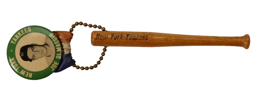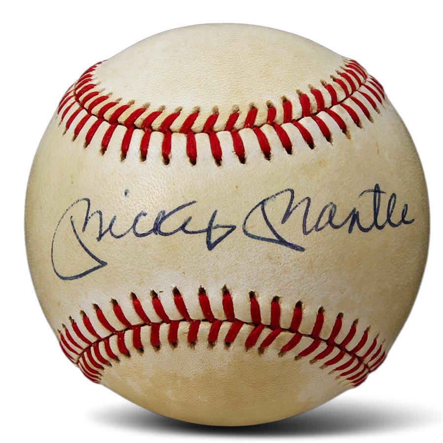 This Yankees legend collection includes a Mickey Mantle signed baseball that features a great signature in blue ink (8/10). This is a Bobby Brown ball which is a bit toned. The set also includes a 1968 Topps Mantle (EX),1957 Topps Mantle (PR) and an extremely clean Joe DiMaggio pin with the original hanger (EX/MT).