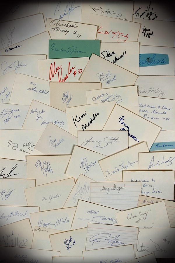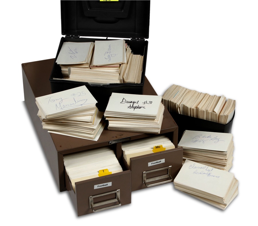 From the collection of the noted Chicago sportswriter comes this near-encyclopedic archive of great and obscure names from the NFL, WFL & college football. Many of the signatures were obtained in person. Many of the bigger names are not present but the collection is very impressive, especially considering the fact that most are identified and in beautiful condition. The dates range from the 1960s to the 1990s and many are vintage. There are a total of about 4,800 pieces here, guaranteeing hours of fun perusing and investigating.