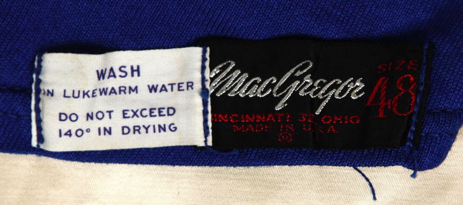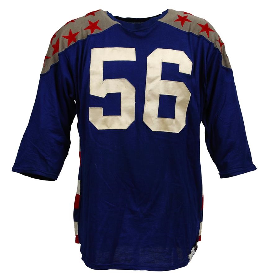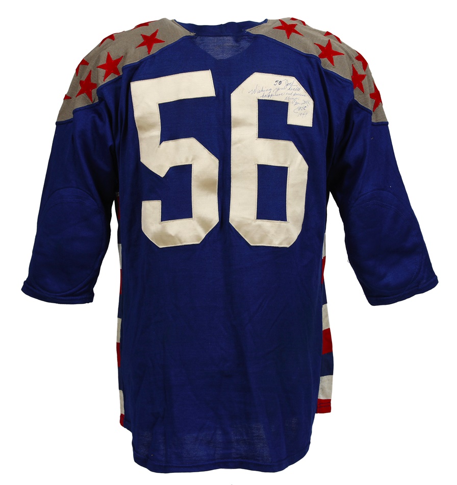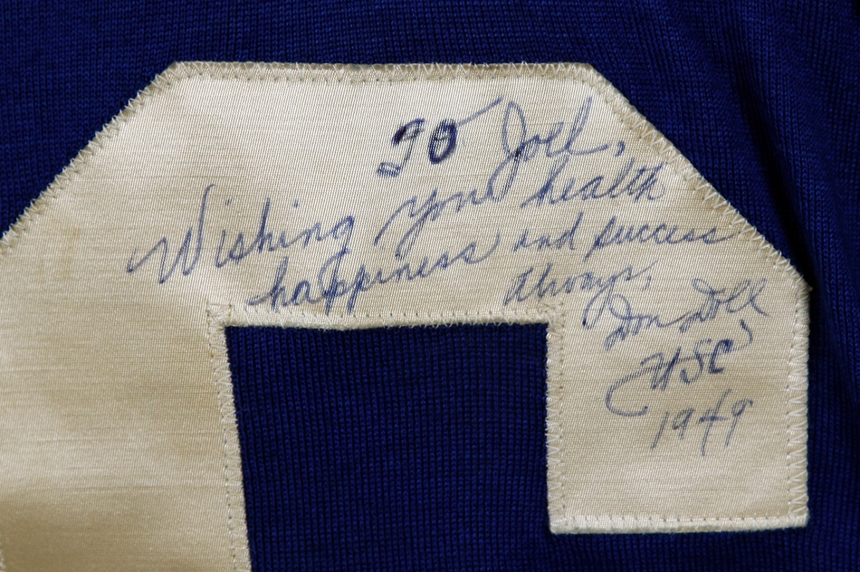 Don Doll is the only player in NFL history to have 10 or more interceptions in three different seasons. During his All-Star rookie campaign of 1949, he tied an NFL record with four interceptions in one game. Here we have Doll's jersey from what would be the first of four Pro Bowls in which he would play during his career. This blue jersey has red stars on grey shoulders. Number "56" in white on front and back. MacGregor size 48 tagging on front tail. Shows light but definite use. Signed and personalized in blue pen on the back. Doll also added "USC 1949" below his signature.
