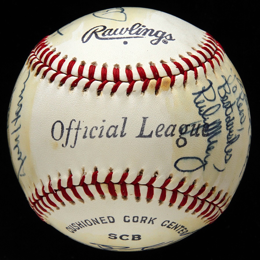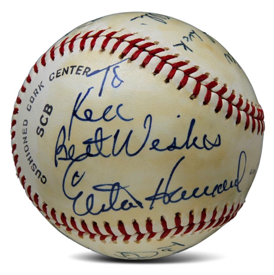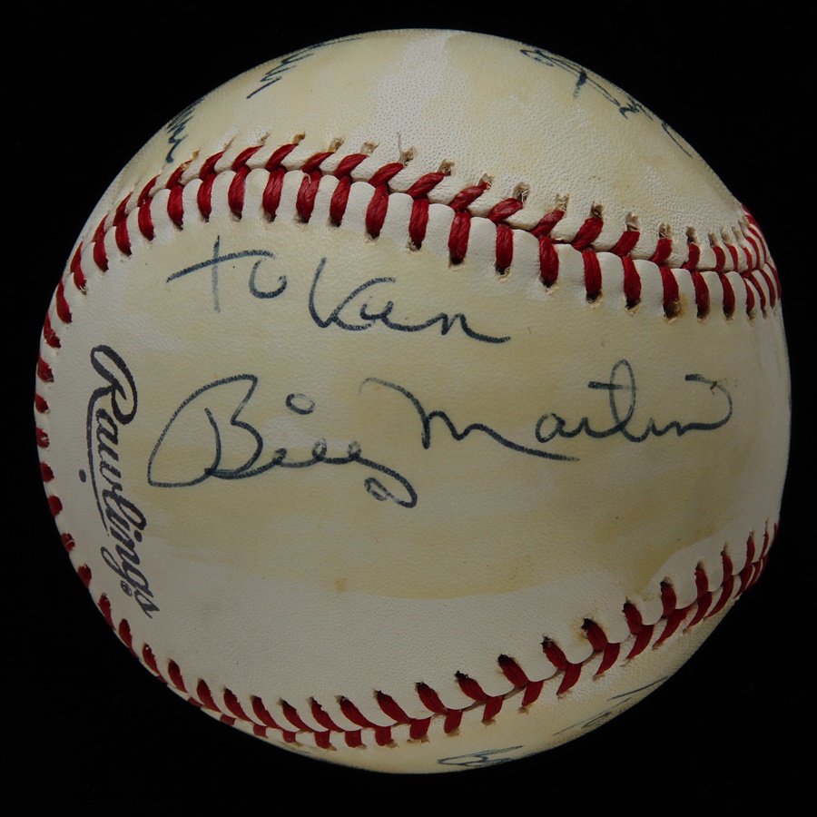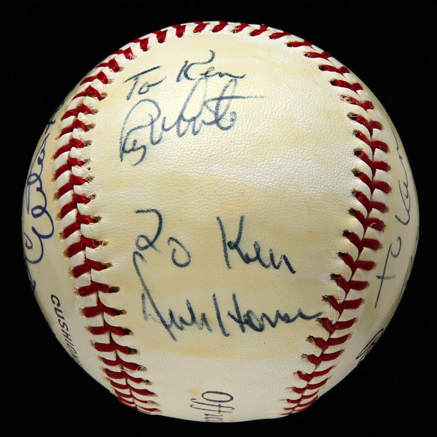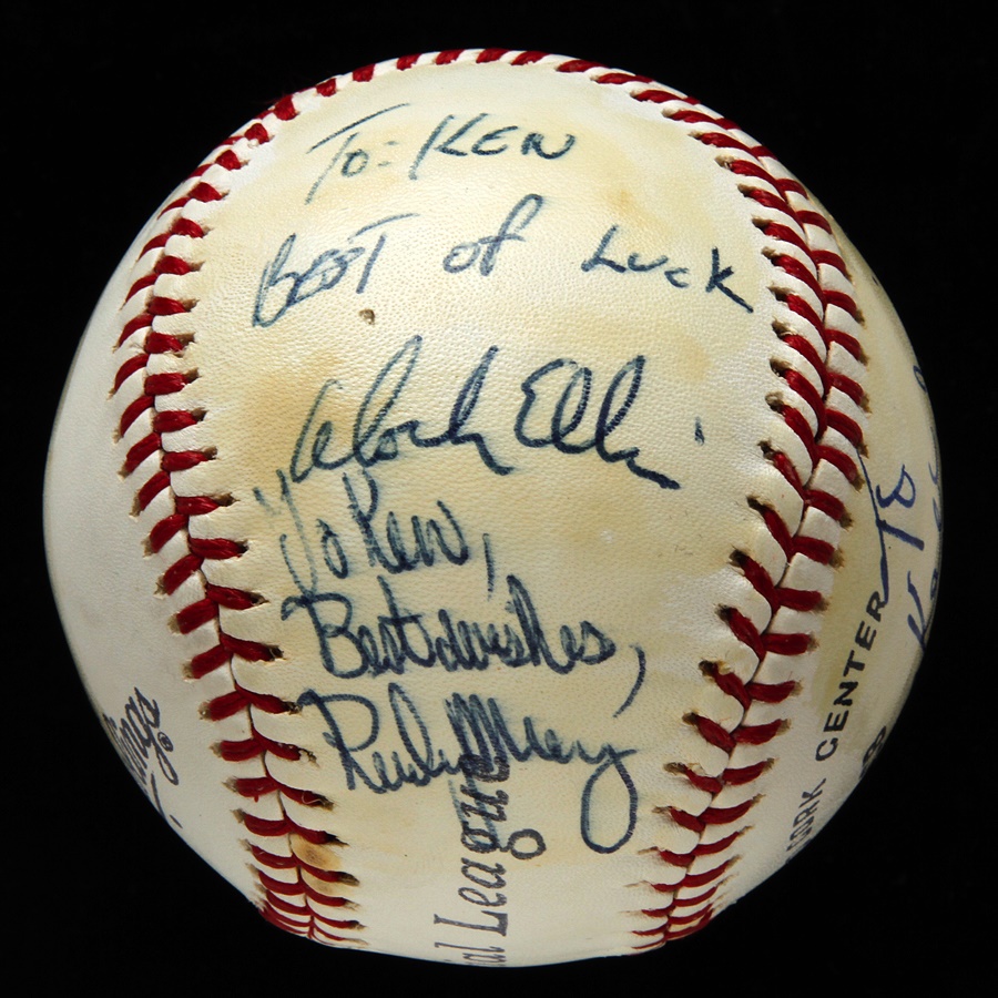 This is not a single signed ball but displays as one. Elston Howard personalized the ball ("To Ken, best wishes") but the signature is killer, 10/10 on a side panel. Also signed by Roy White, Dick Howser, Billy Martin, Dock Ellis and Rudy May. Rawlings Official League baseball is clean (EX) but has light shellack over signatures.