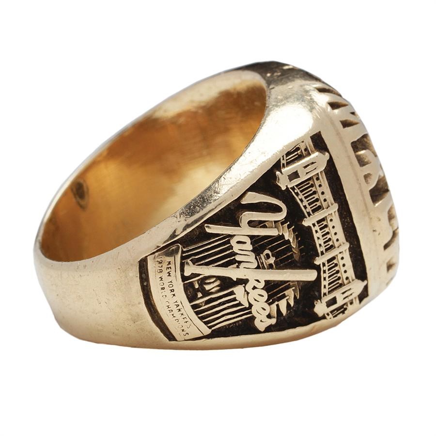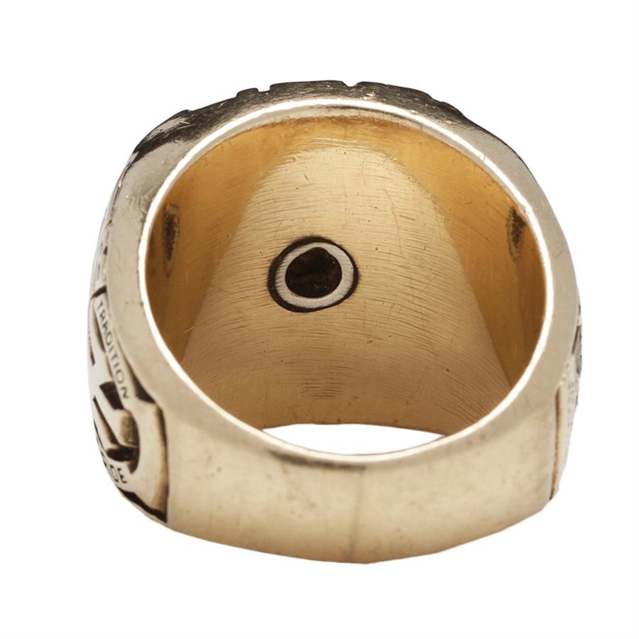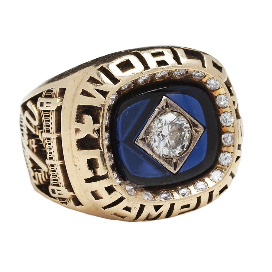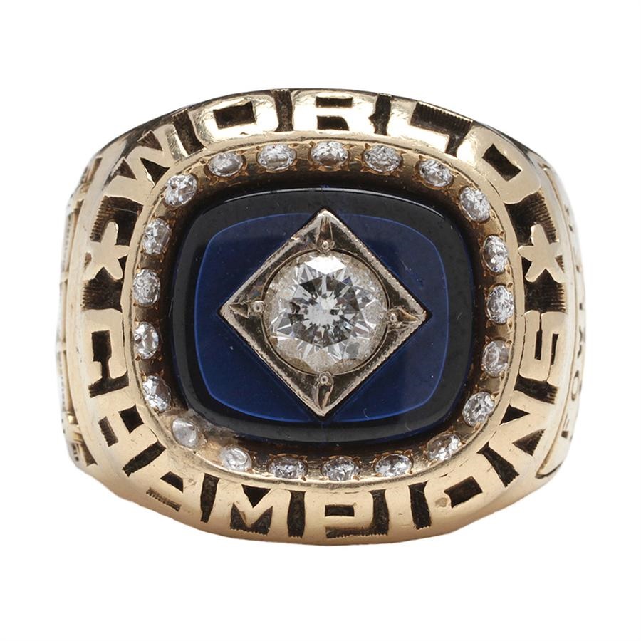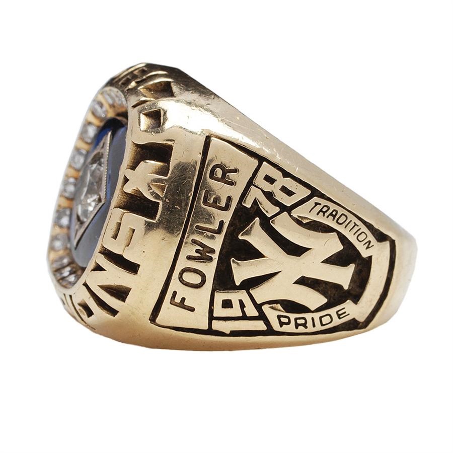 After his somewhat pedestrian ten-year playing career came to a close, Art Fowler joined the coaching ranks, where he made his mark. As a close friend of Billy Martin, the pitching coach followed much of the fiery helmsman's journeys, but a key stop was in the Big Apple, where Ron Guidry captured the 1978 Cy Young Award in leading his team to the championship. This ring was awarded to Fowler and like the team that won the crown, it's the real deal. This size 10 ring features a real diamond set in a baseball diamond on a deep blue background, surrounded by the words World Champions. The right shank has Fowler's name above the year and interlocking Yankee "NY" with the right sporting the Stadium facade above the Yankee bat logo and the championship trophy. It is stamped inside "14K LGB," as well as "Greatest Comeback In History" as the Bombers swept the LA Dodgers after dropping the first two games of the series. EX-MT condition.