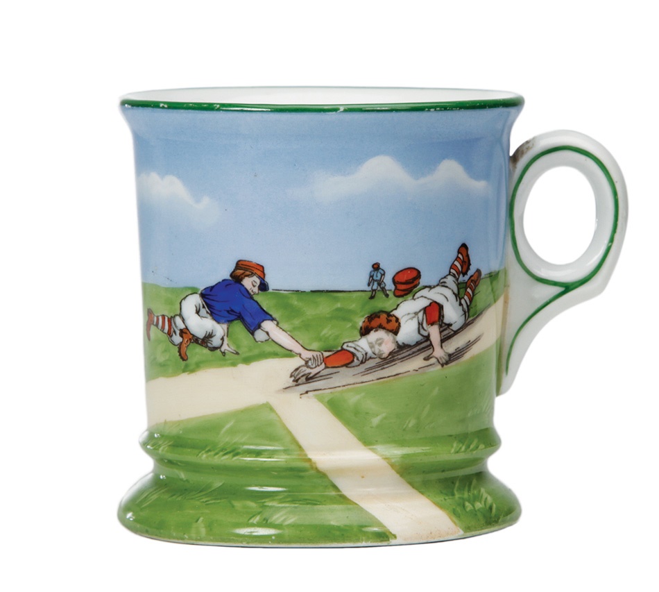 This extremely rare Austrian shaving mug from the turn of the century comes from a porcelain set and is the first of its kind we have seen. It features the depiction of a tag play on a sliding runner and is NRMT condition.