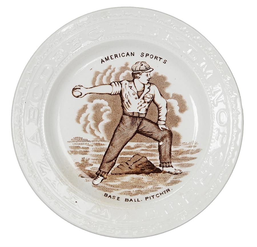 Measuring 6.25" in diameter, this 150-year-old white paste plate appears like new and is easily the nicest one we've ever seen. The brown-and-white image of a pitcher on the mound is crisp, clean and perfect. It reads: "AMERICAN SPORTS" above the image and "BASEBALL PITCHER" below it. The alphabet rings the perimeter. A special piece!