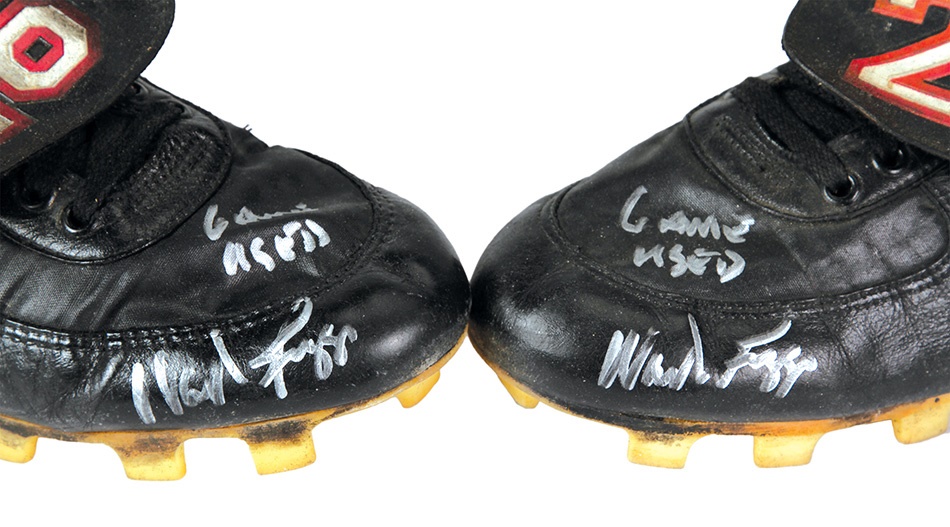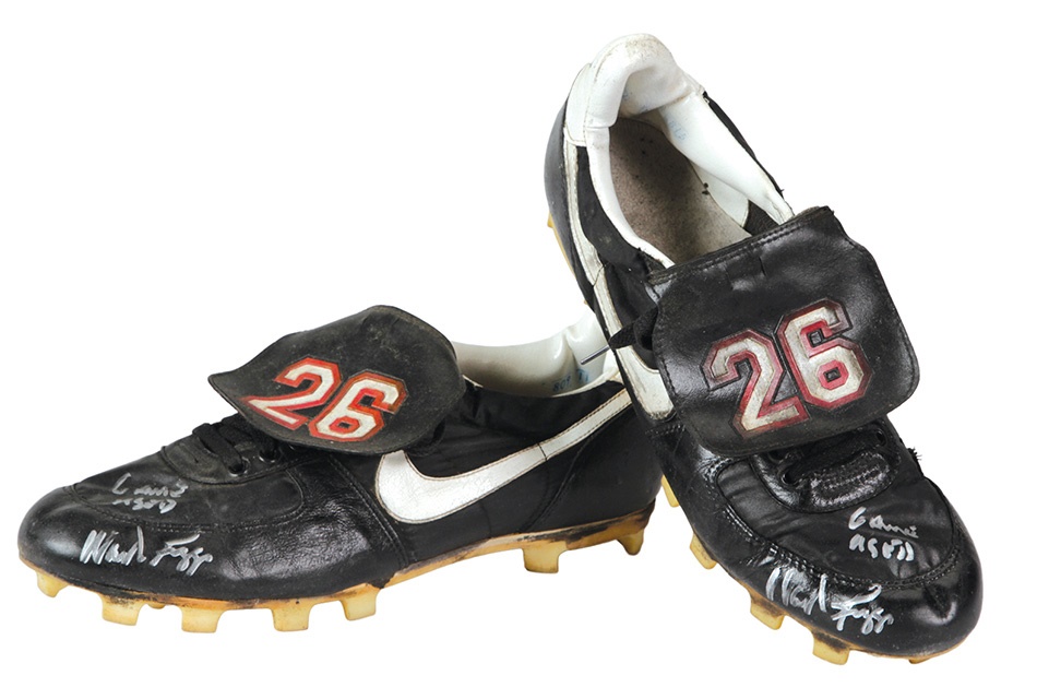 These black and white Nike spikes were used by Boggs while playing with the Red Sox and are size 12. The custom tongues feature his famous "26." Both are signed "Game Used, Wade Boggs" and show nice use. Boggs played with Boston between 1982 and 1992, racking up all five of his batting titles.