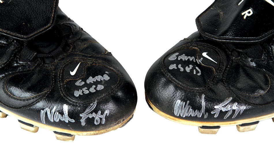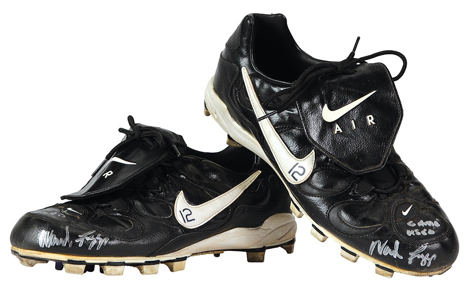 After 11 seasons with the Red Sox, Wade Boggs irked Red Sox Nation by signing a three-year deal with their archrival New York Yankees. The All-star third baseman wound up playing five seasons in the Bronx, including the World Series championship year of 1996. Boggs laced up these black and white Nikes during his Yankee years. They are size 11.5 and show nice use. Both are signed "Game Used, Wade Boggs." Number "12" is written in black marker on the sides of both spikes.