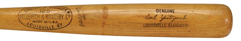 Perhaps the most beloved player in Boston Red Sox history is the man known as "Yaz," with Carl Yastrzemski having played all of his 23 Major League seasons in Beantown. This game used Louisville Slugger was obtained directly from the Sox slugger by a fan who attended a game against the White Sox in Chicago. Comes with ticket from the game dated March 8th 1968. Also comes with snapshots taken that day (9). The bat is cracked, but is glued to one piece, measures 34.5" in length and weighs 35 oz. From 1968, this is one of the nicer Yaz specimens you will see AND it comes with provenance placing it in his batter's hand. Also comes with roster with six signatures, including Reggie Smith and Dick Williams.