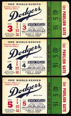 The embattled borough of Brooklyn finally conquers the Yanks. Stubs from World Series Games 3, 4 and 5 are EX.