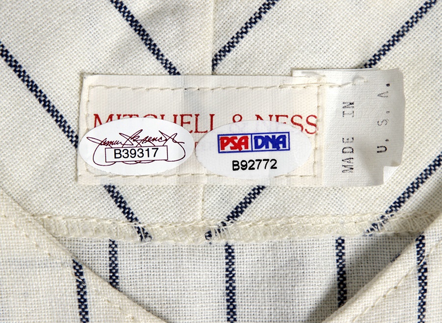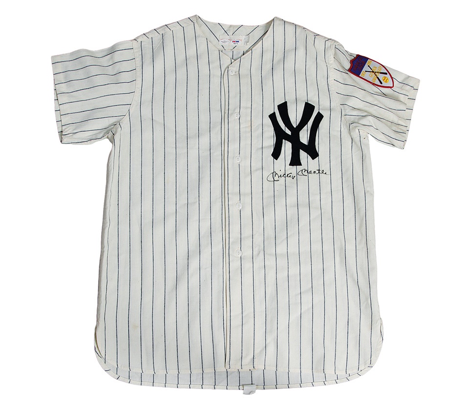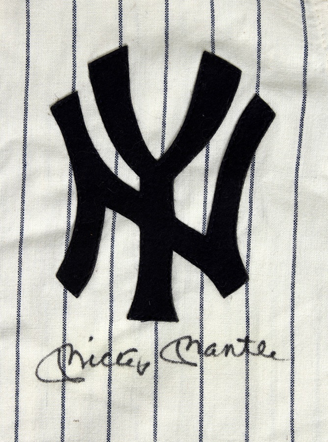 The iconic Mickey Mantle is front and center in this lot as he autographed this replica home jersey from the Hall of Famer's unforgettable rookie season. The Mitchell & Ness label adorns the rear collar, along with PSA/DNA and JSA stickers. There is a 1951 Golden Anniversary patch on the sleeve and "The Mick's" signature in black Sharpie grades 9/10. Mantle's first major league game was a home clash vs. the rival Boston Red Sox and also signaled the first game of legendary public address announcer Bob Sheppard.